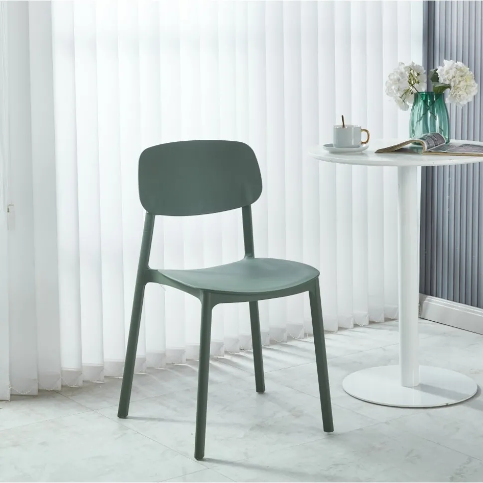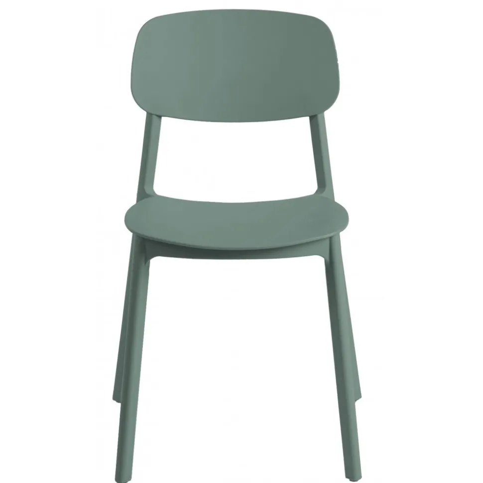 Grön stapelbar i väderbeständig polypropylene-plast. Matstolen går både att använda inomhus och utomhus.