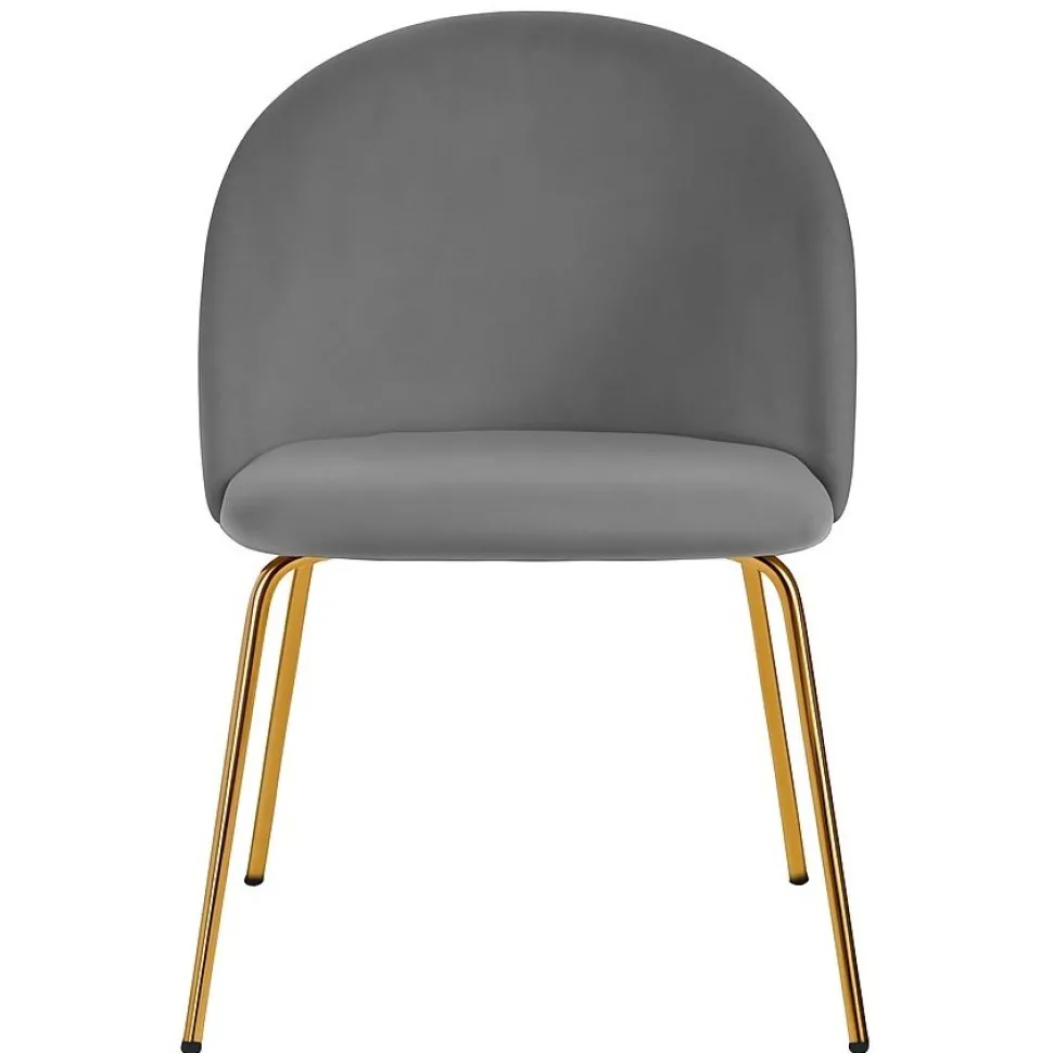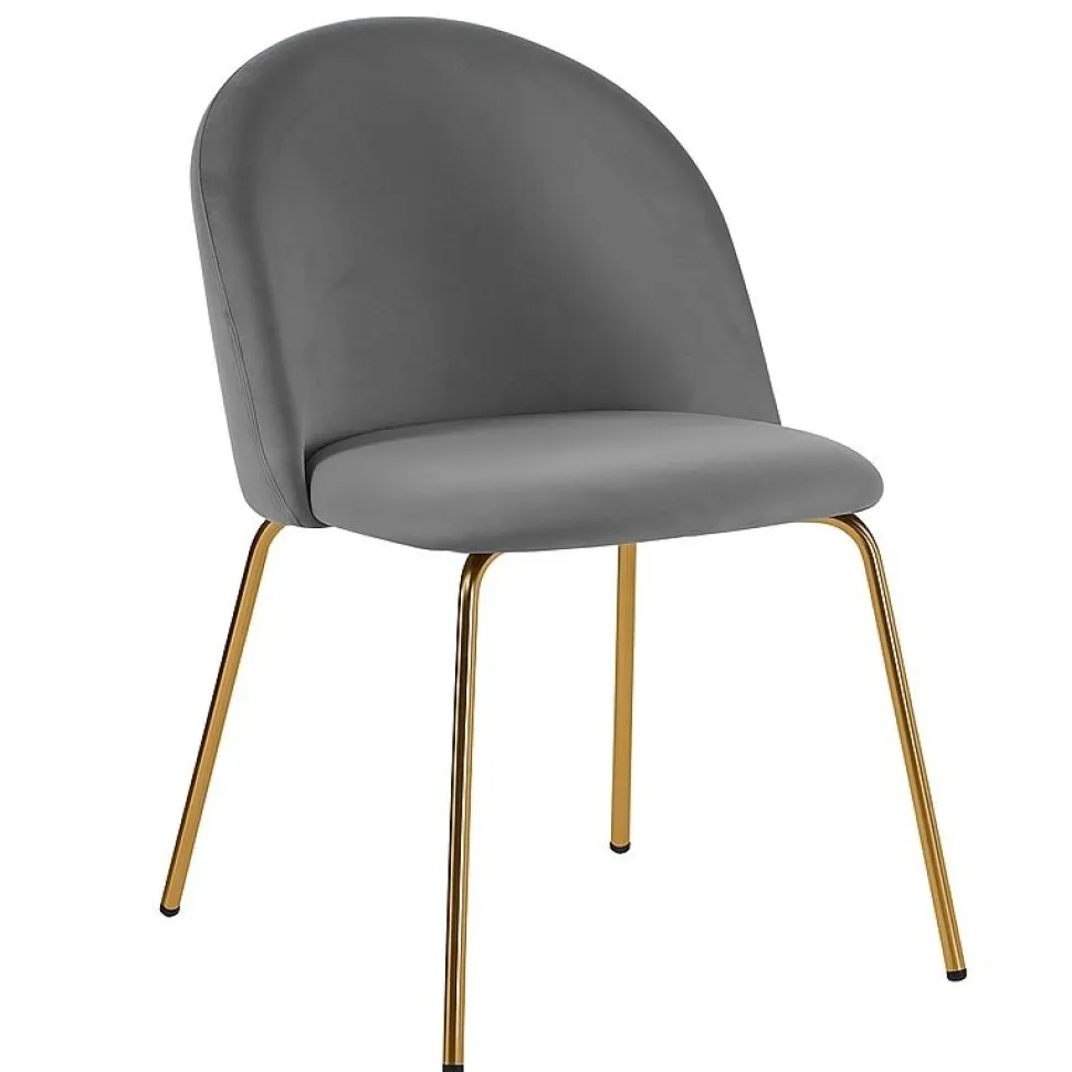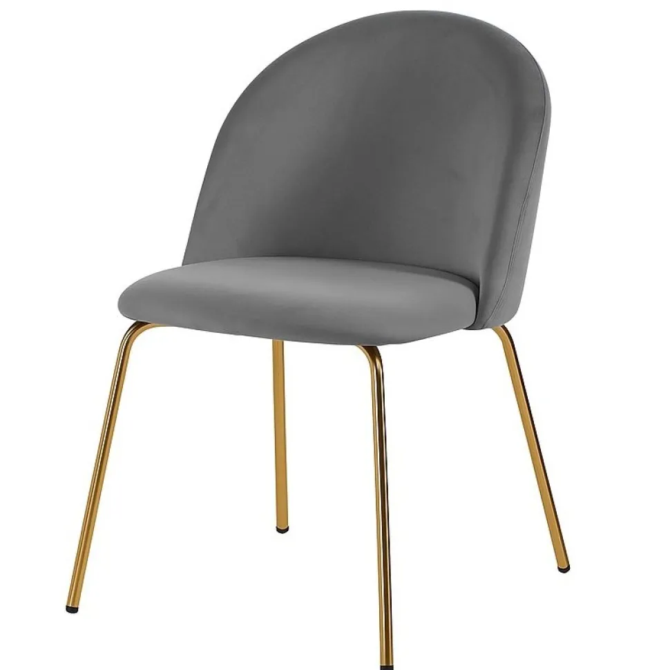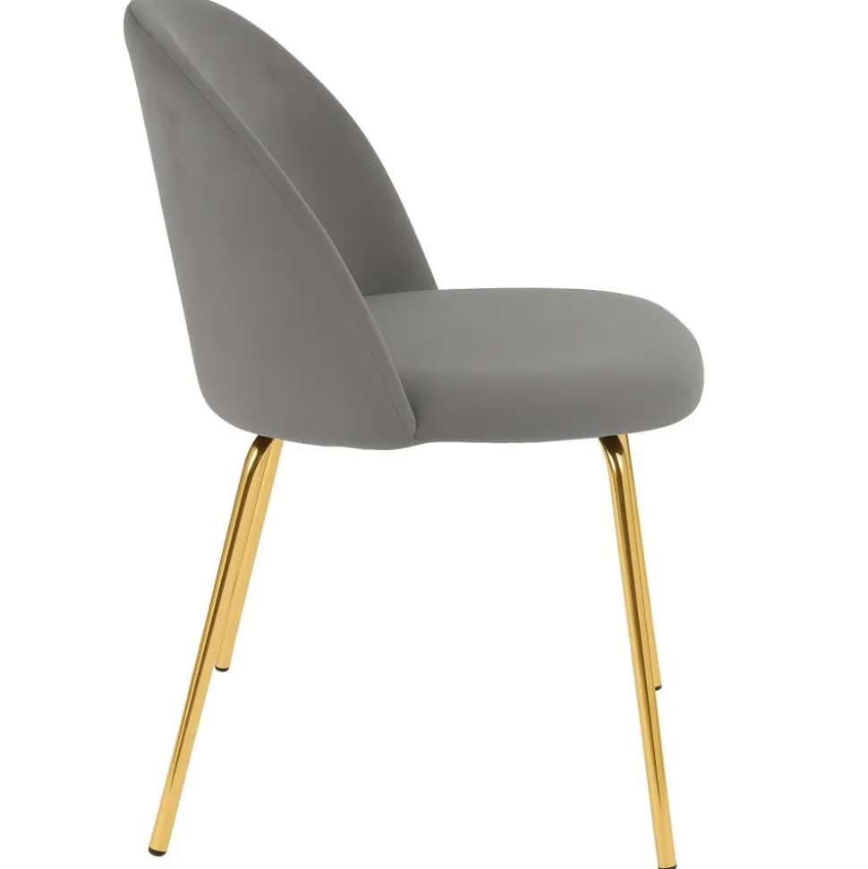 Stolen är klädd i ett mjukt grått sammetstyg med ben i blank mässing. Kombinationen ger stolen en exklusiv känsla och utseende. Skön till matbordet.
