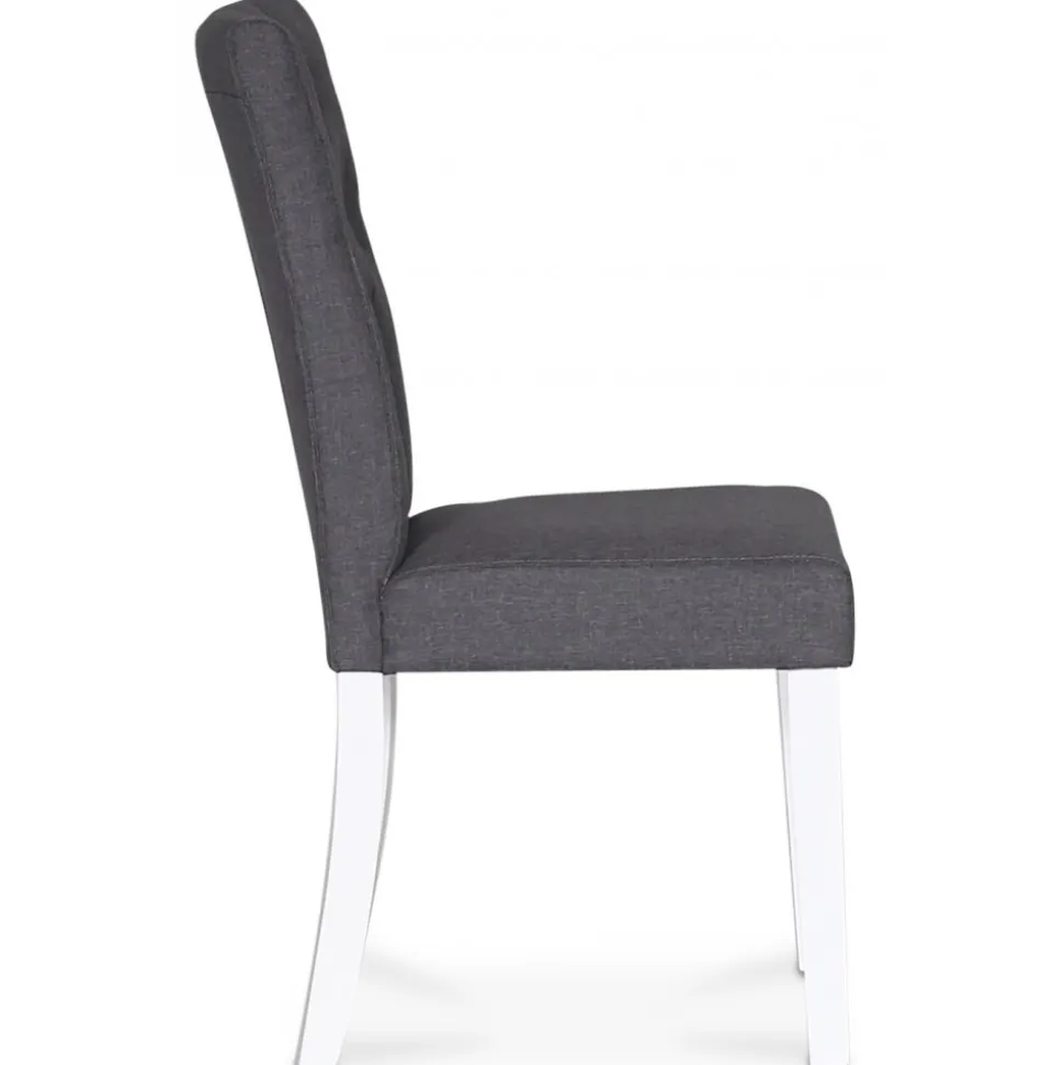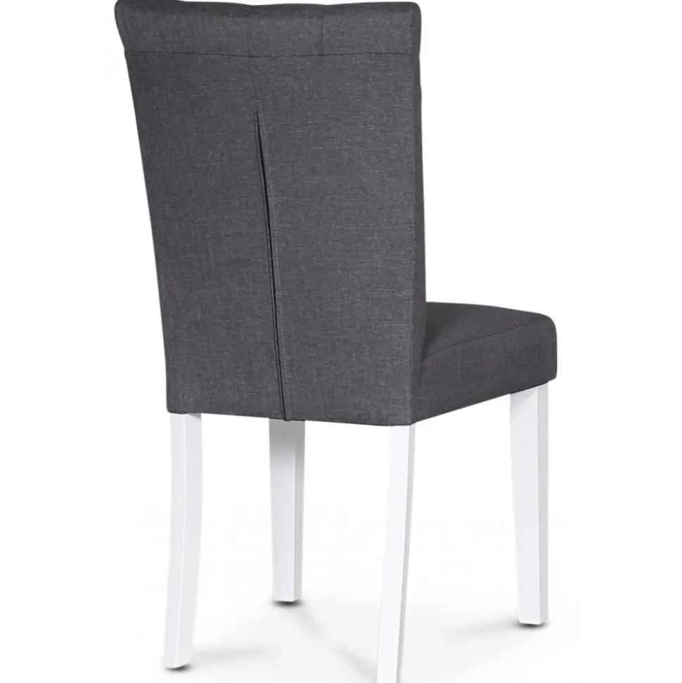 De vitlackade träbenen ger en ljus och fräsch känsla, medan de små knapparna i ryggen fungerar som en elegant detalj som lyfter stolens design.