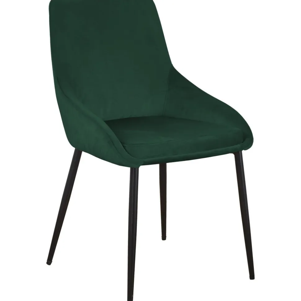 Theo är en sammetsstol som kombinerar skön sittkomfort med modern och snygg design. Den har ett mörkgrönt lyxigt sammetstyg som ger stolen ett exklusivt och sofistikerat utseende. Svarta metallben kompleterar stolens design och ger den en elegans.
