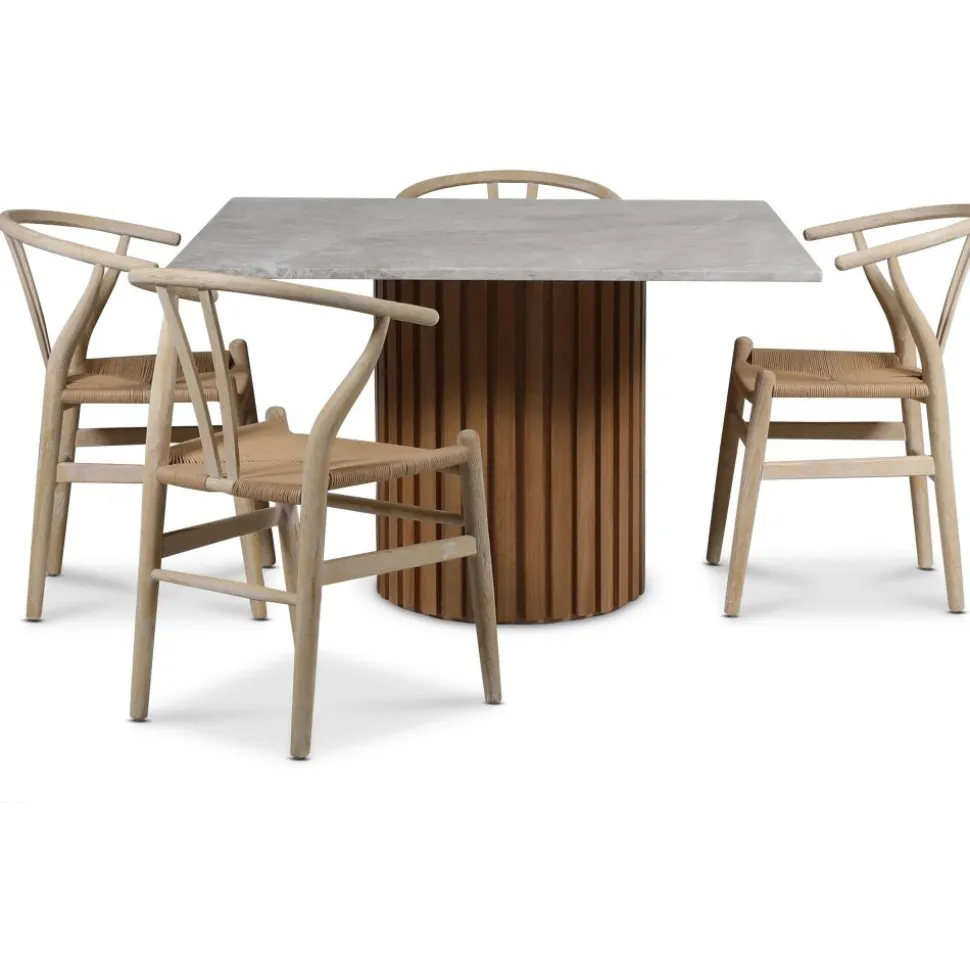 Klassiska matstolar i karm-modell med stomme i whitewash-behandlat almträ och flätad repsits av papperssnöre. Levereras monterad.