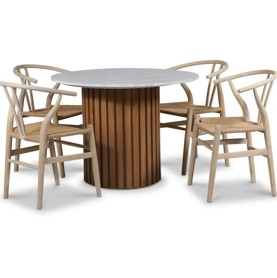 - Sumo matgrupp Ø105 cm inkl. 4 st Brandon matstolar whitewash – Oljad ek / Ljus marmor