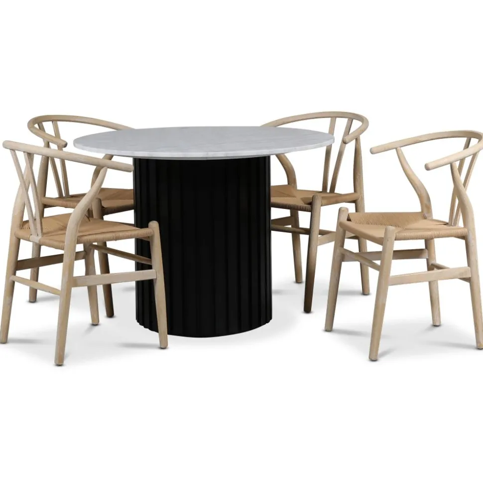 Klassiska matstolar i karm-modell med stomme i whitewash-behandlat almträ och flätad repsits av papperssnöre. Levereras monterad.