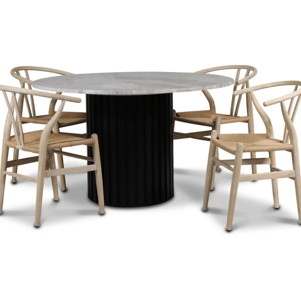 - Sumo matgrupp Ø130cm inkl. 4 st Brandon matstolar whitewash – Svartbets / Silver marmor