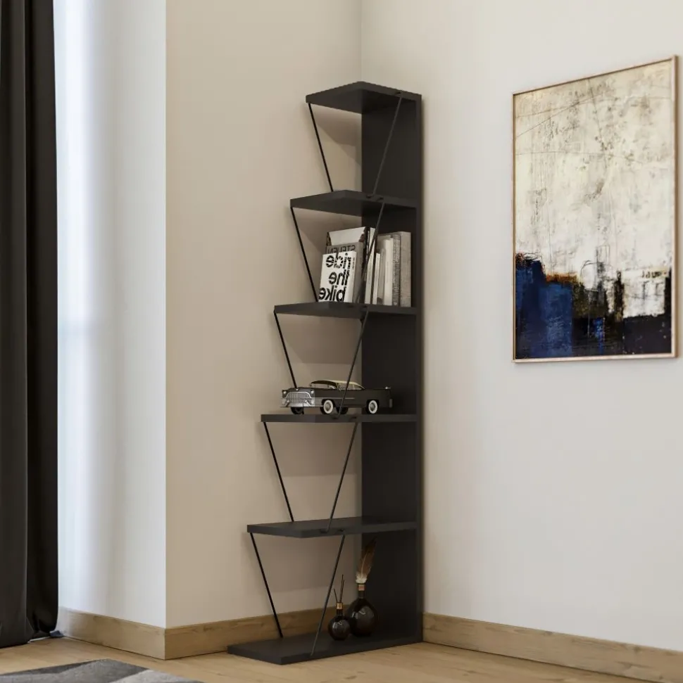 Bokhylla av trä och metall.