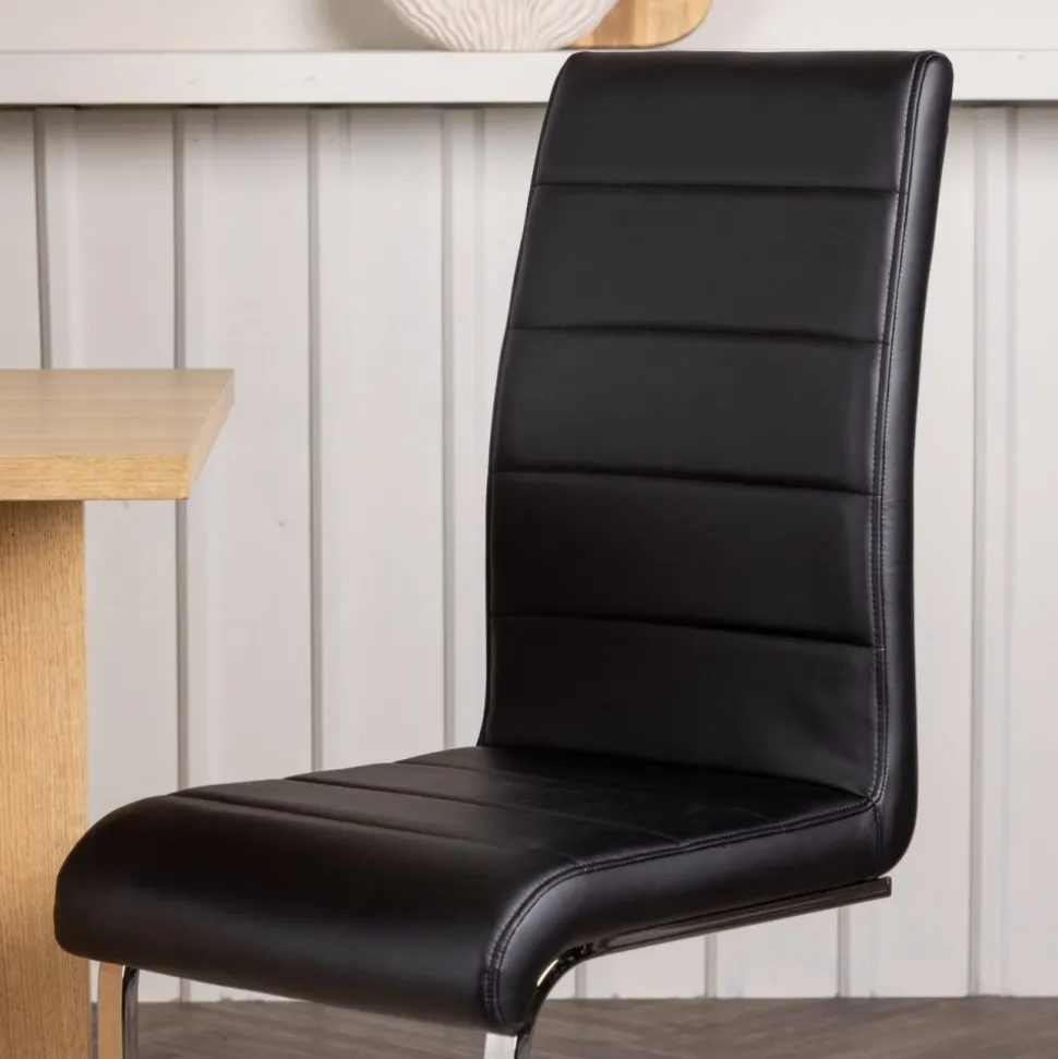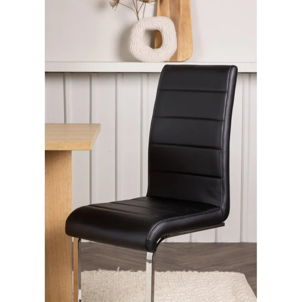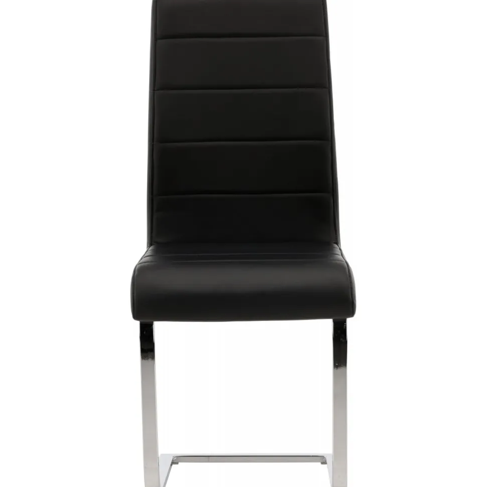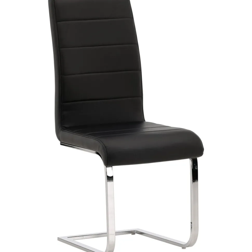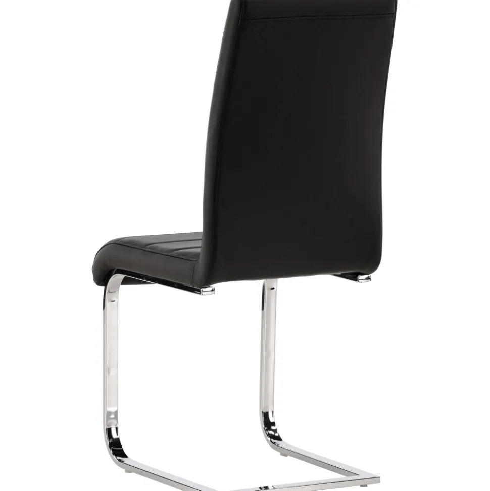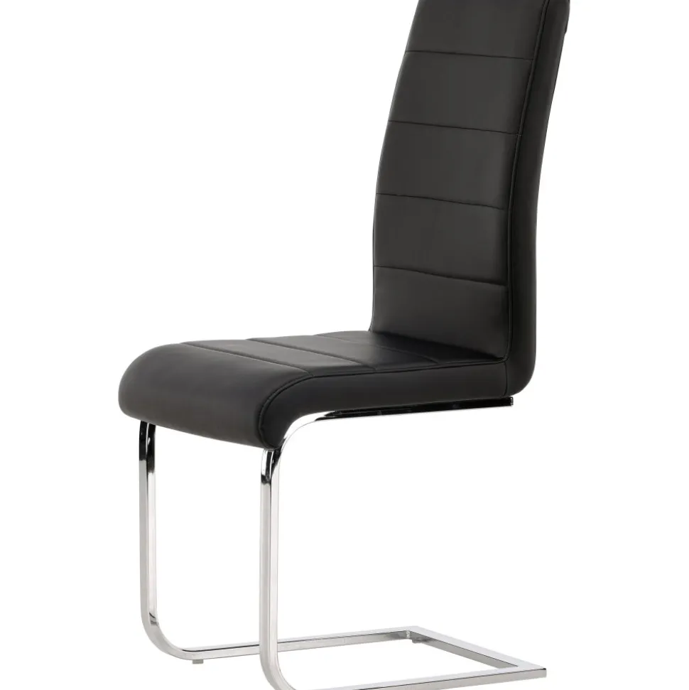 Matstol som har en trendig design med raka nordiska former och dekorativ stomme. Stolen är i svart konstläder med kromade metallben. Benens design gör att stolen sviktar behagligt och ger dig ett skönt gung. Matcha med ett pampigt matbord så får du en komplett matgrupp att pryda hemmets hjärta med!