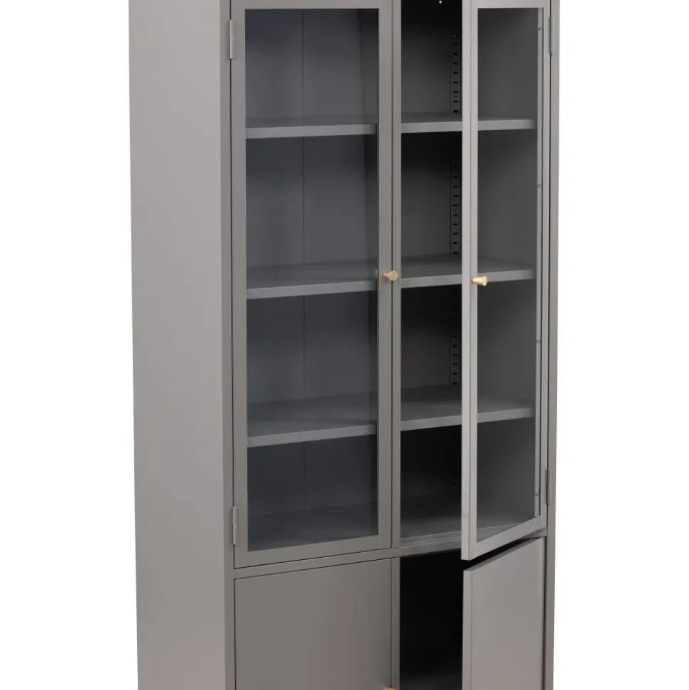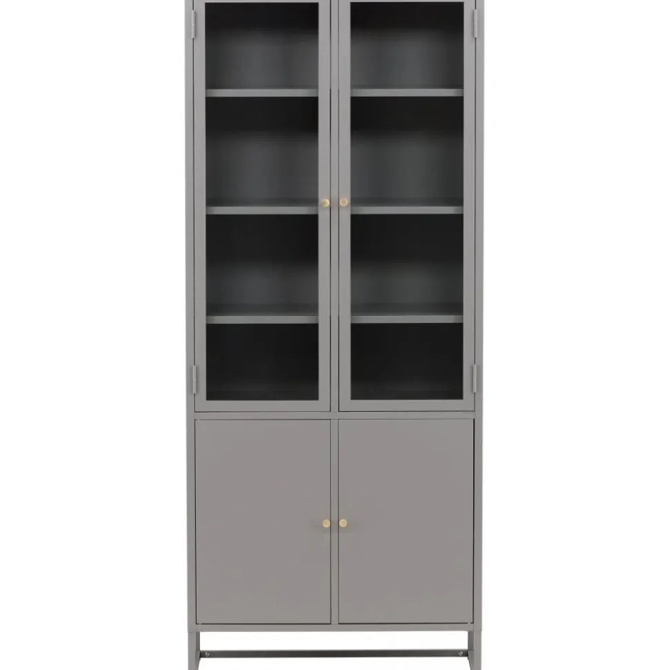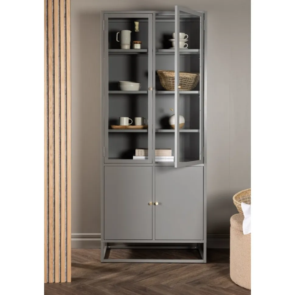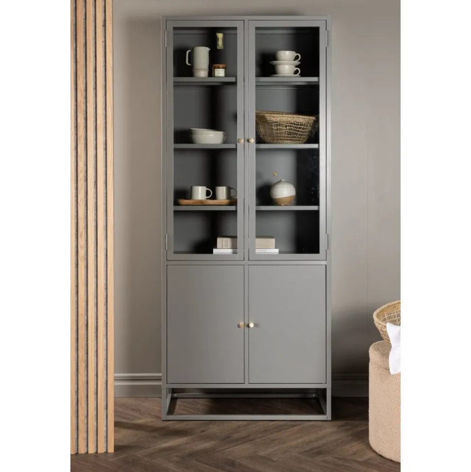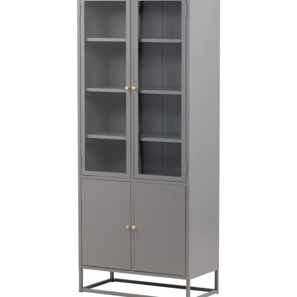 Vårt omtyckta skåp Torsnäs i modern industriell design är tillverkad i pulverlackerat ljusgrått stål och står sig över tid. Skåpet möjliigör både dold och öppen förvaring och passar utmärkt i det moderna vardagsrummet. Ovandelen har två höga dörrar i glas med en ram av pulverlackerad ljusgrått stål och fyra avlastningsytor för öppen förvaring. Nederdelen har två lägre dörrar med dold förvaring i pulverlackerad ljusgrått stål och två avlastningsytor. Samtliga dörrar har mässingfärgade knoppar vilket blir en snygg detalj. Hela skåpet vilar på en öppen ram i ljusgrått pulverlackerad stål som ger en luftig känsla och underlättar också för dammsugaren. Möblera ditt hem stilrent och smart.