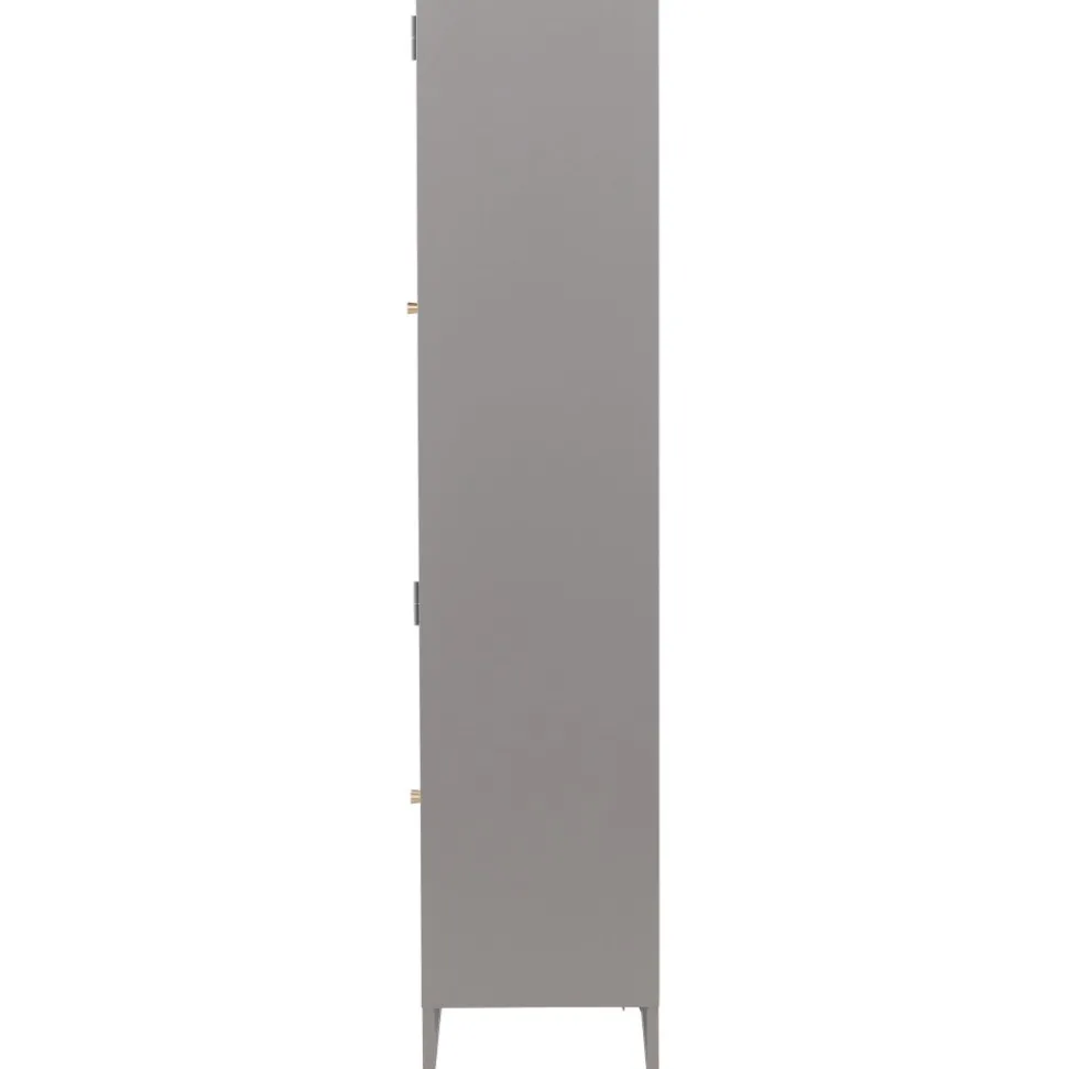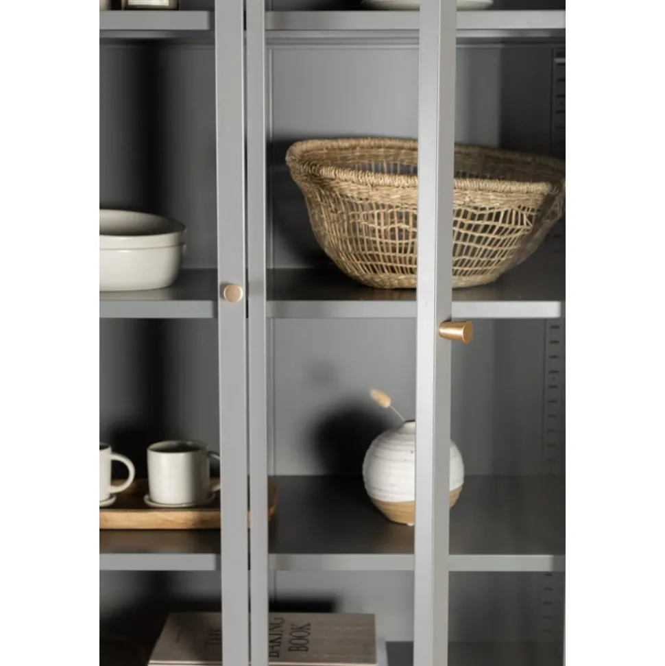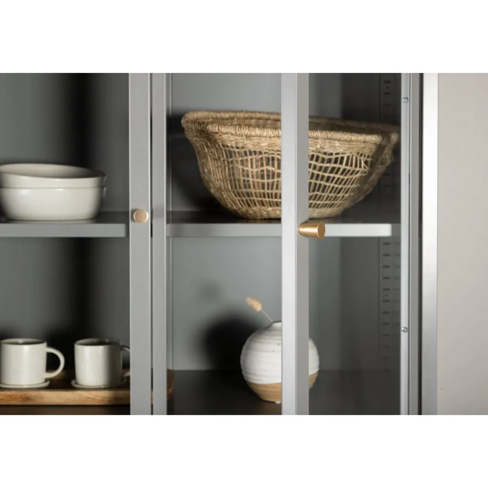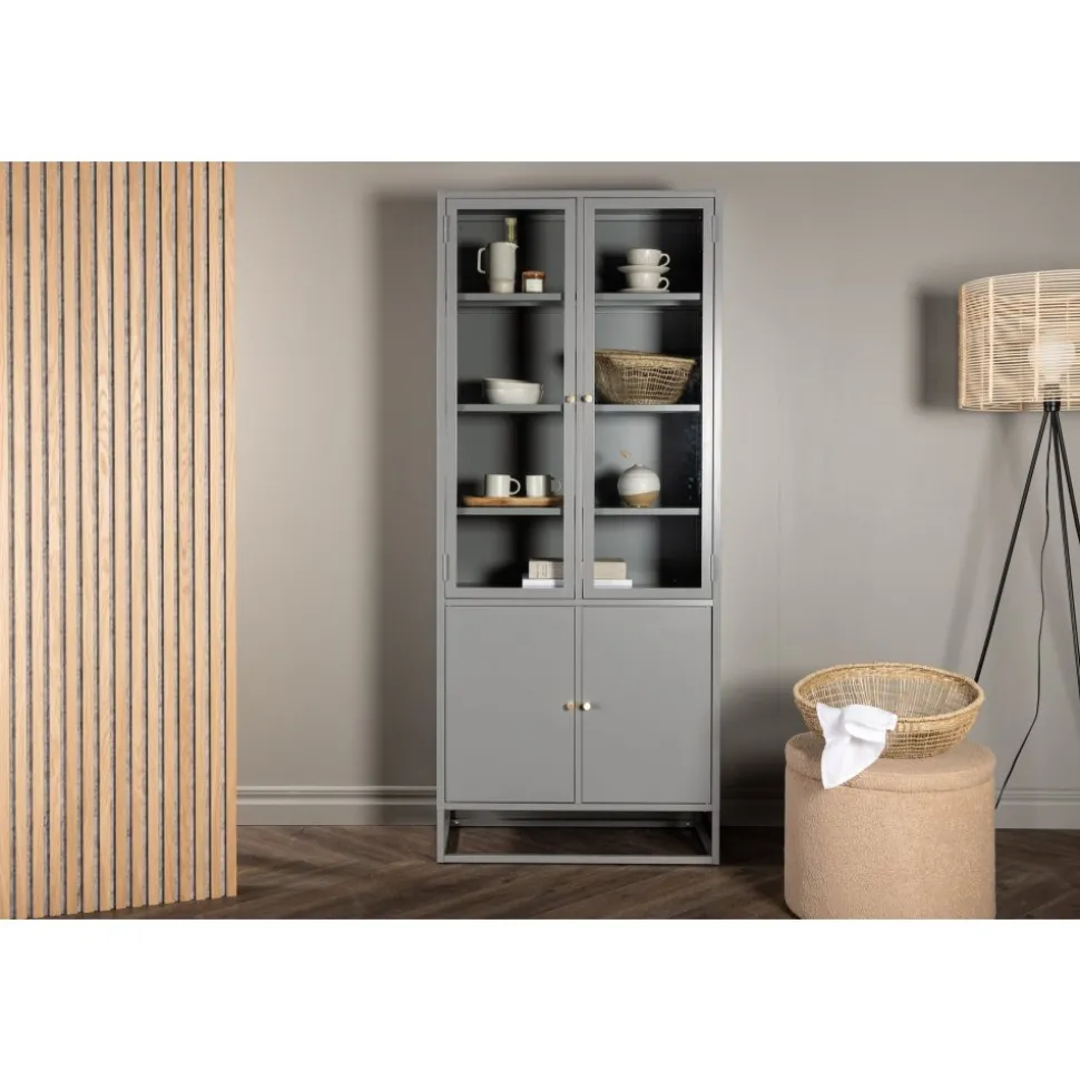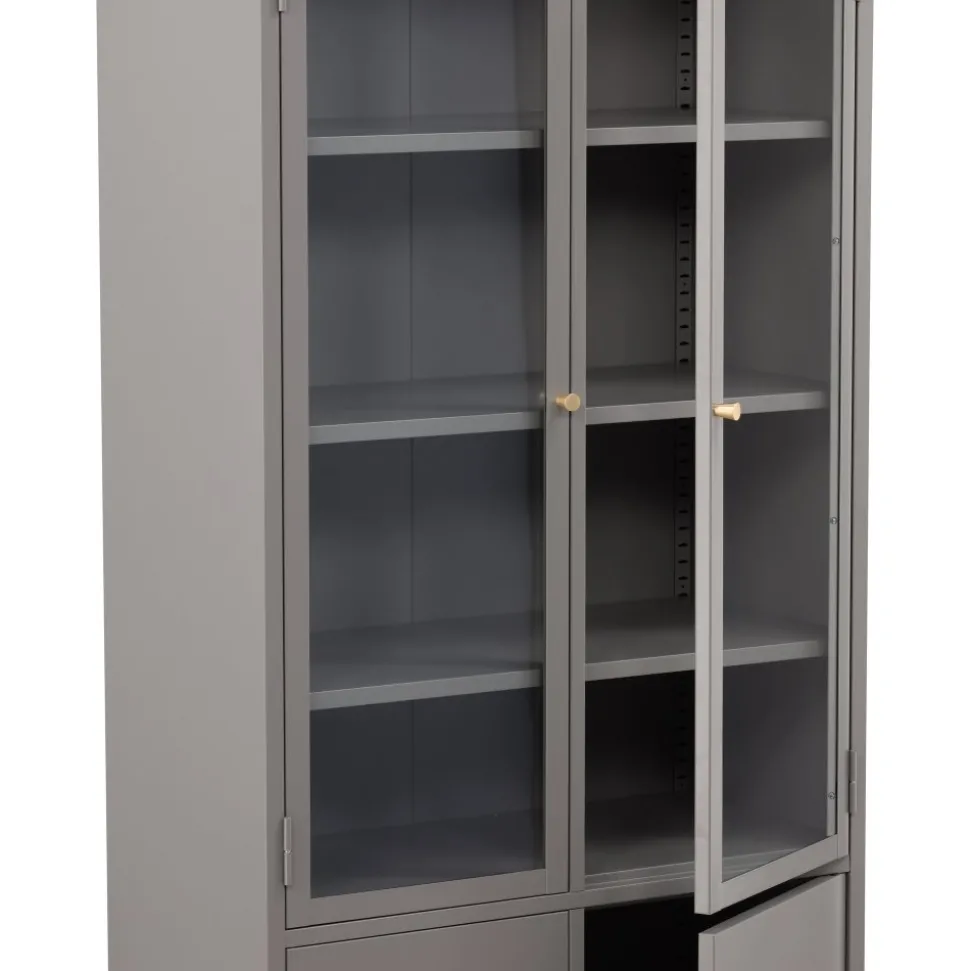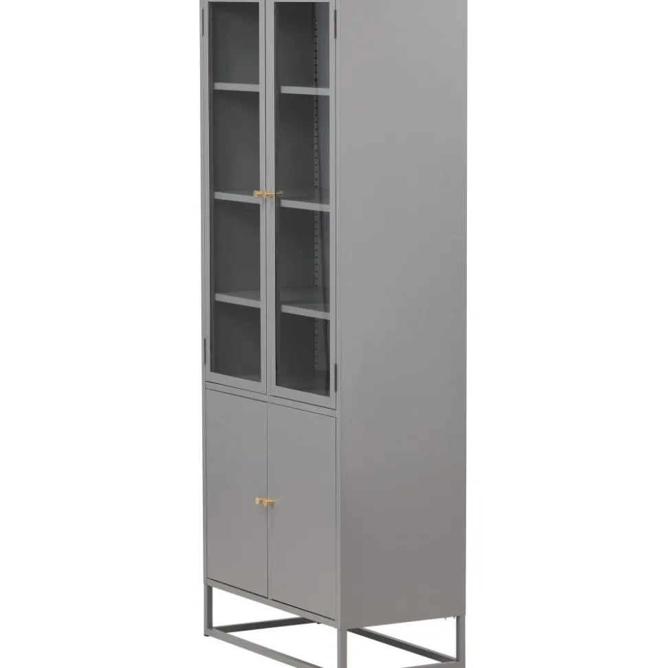 Vårt omtyckta skåp Torsnäs i modern industriell design är tillverkad i pulverlackerat ljusgrått stål och står sig över tid. Skåpet möjliigör både dold och öppen förvaring och passar utmärkt i det moderna vardagsrummet. Ovandelen har två höga dörrar i glas med en ram av pulverlackerad ljusgrått stål och fyra avlastningsytor för öppen förvaring. Nederdelen har två lägre dörrar med dold förvaring i pulverlackerad ljusgrått stål och två avlastningsytor. Samtliga dörrar har mässingfärgade knoppar vilket blir en snygg detalj. Hela skåpet vilar på en öppen ram i ljusgrått pulverlackerad stål som ger en luftig känsla och underlättar också för dammsugaren. Möblera ditt hem stilrent och smart.
