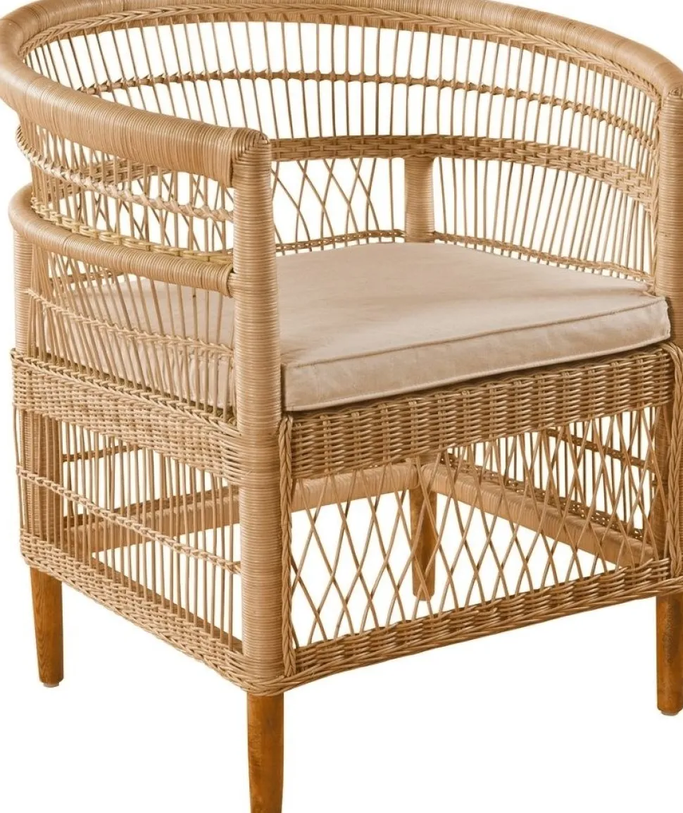 Fåtölj i naturfärgad rotting med dyna i ljust tyg. Tål inte att ha ståendes utomhus utan behöver vara under tak.