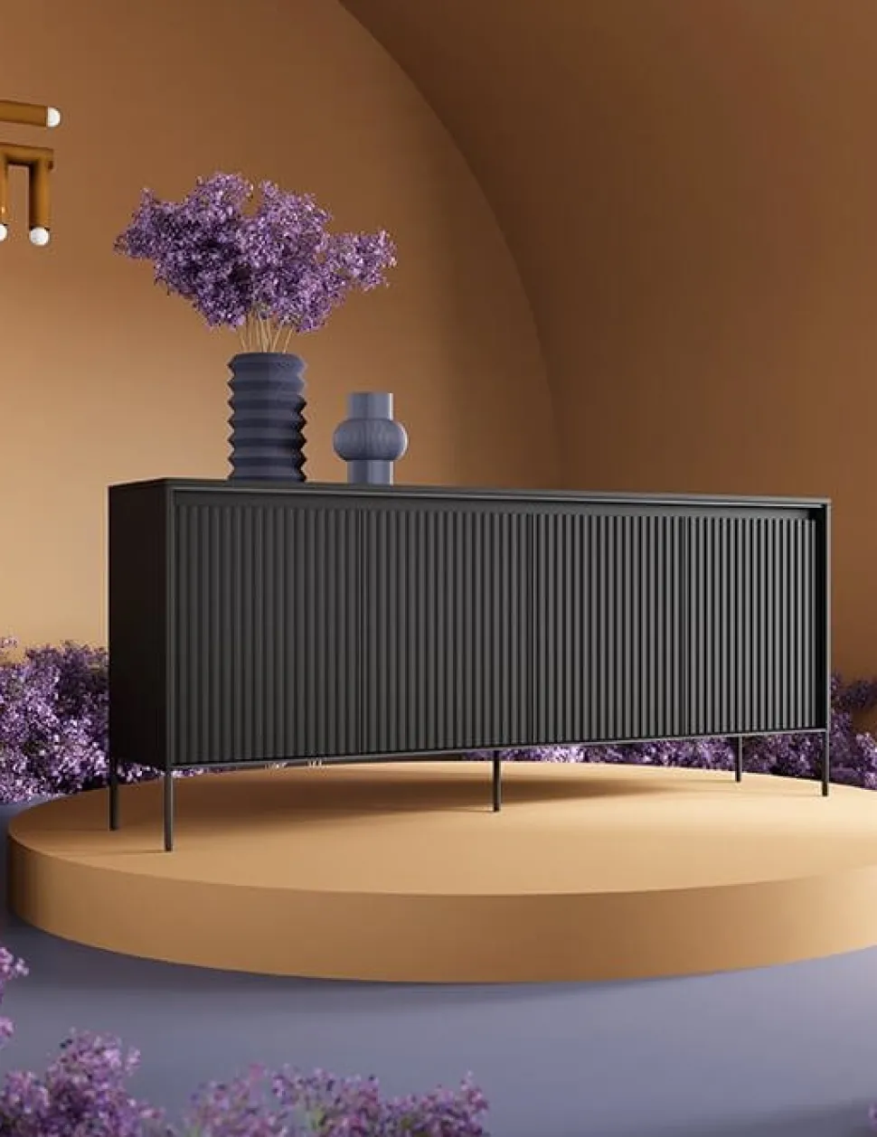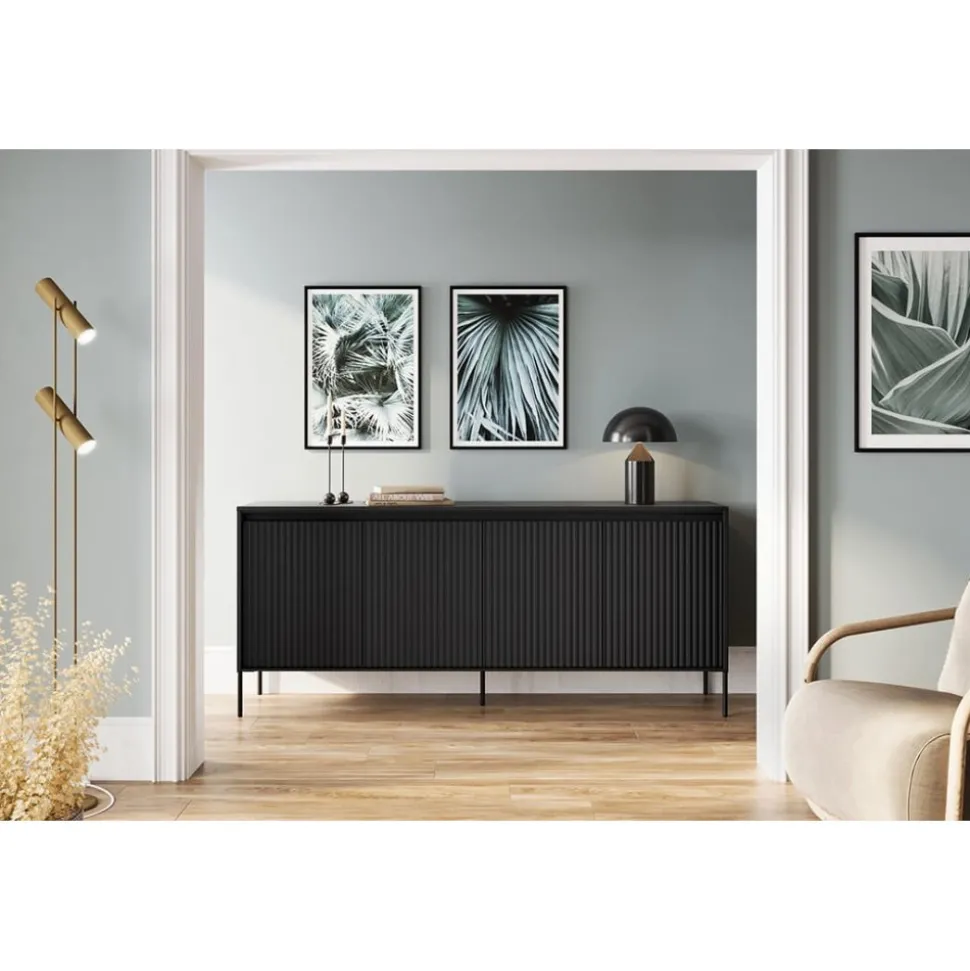 Skänk av laminerad spånskiva med LED-belysning och ben av metall. Levereras omonterad.
