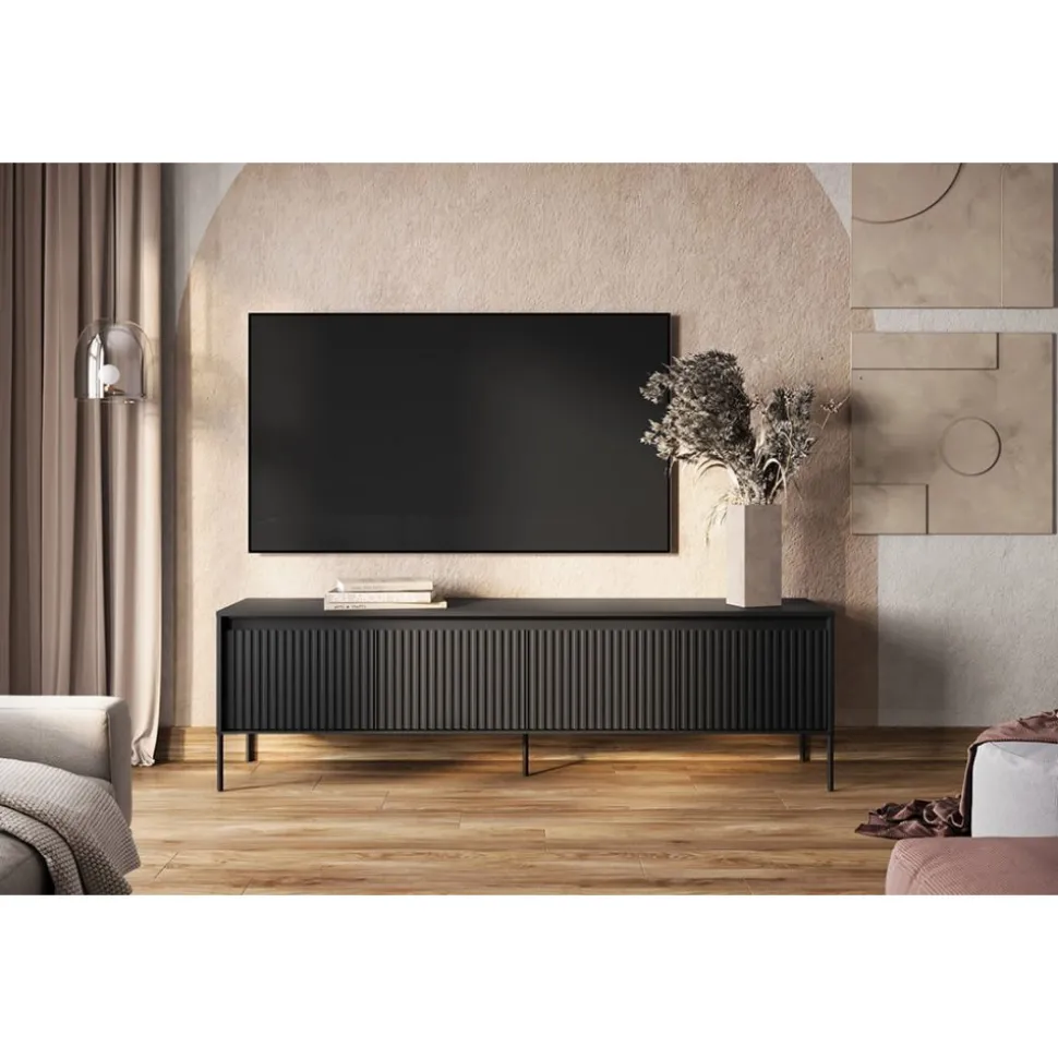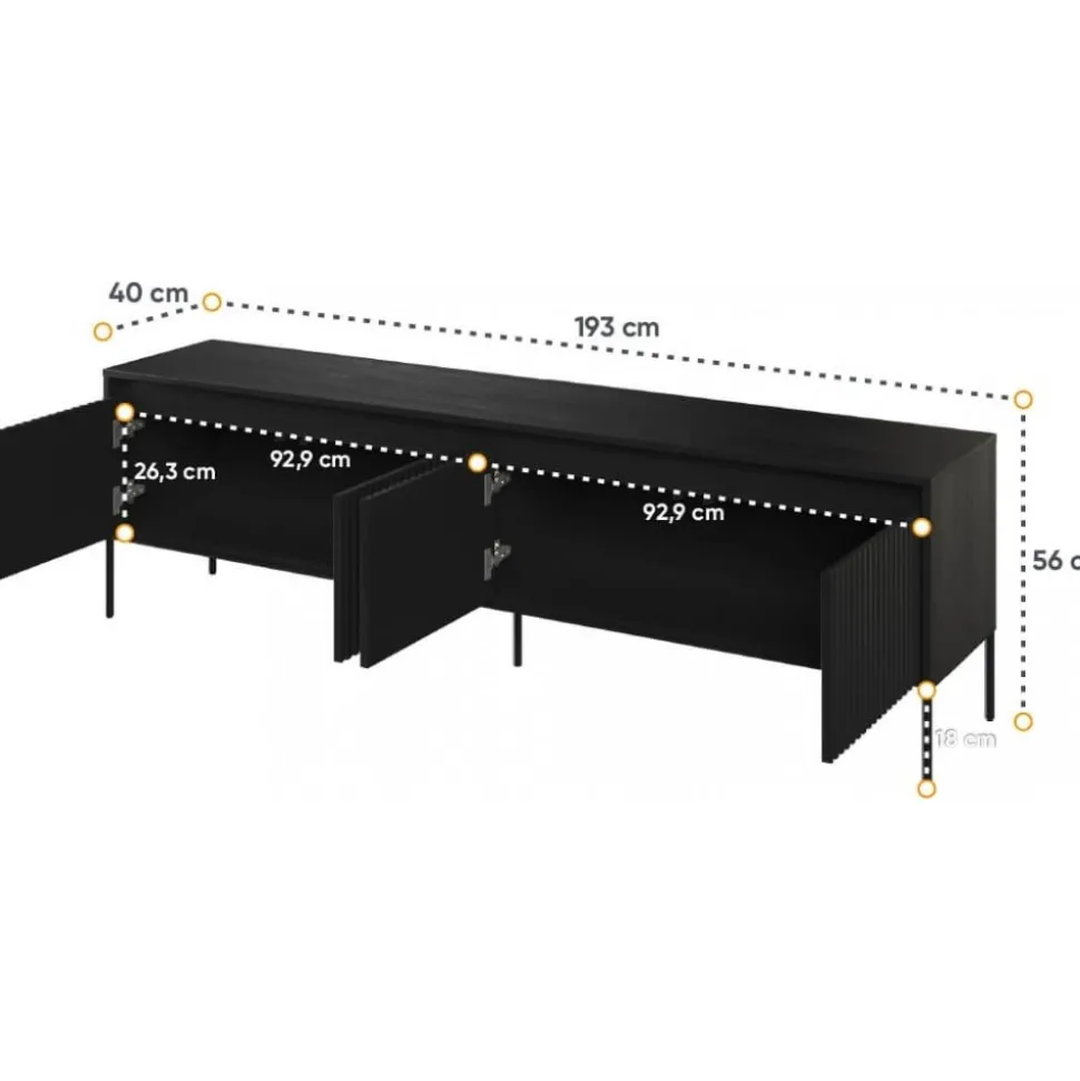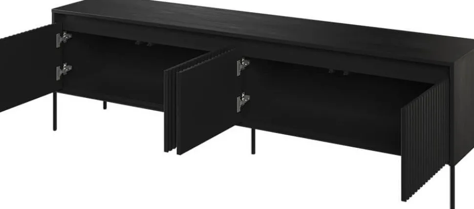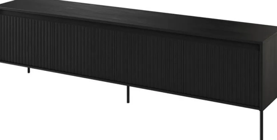 Mediabänk av laminerad spånskiva med LED-belysning och ben av metall. Levereras omonterad.