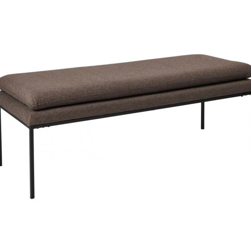 Sittbänk klädd i brunt polyestertyg med svarta metallben och dyna.