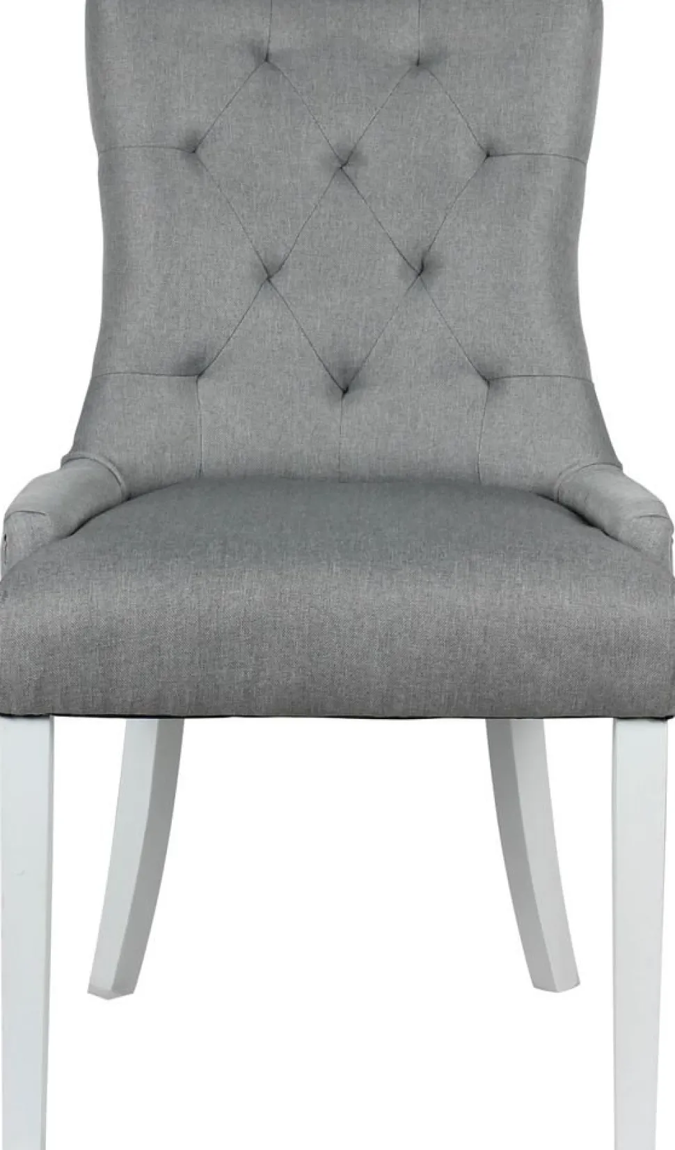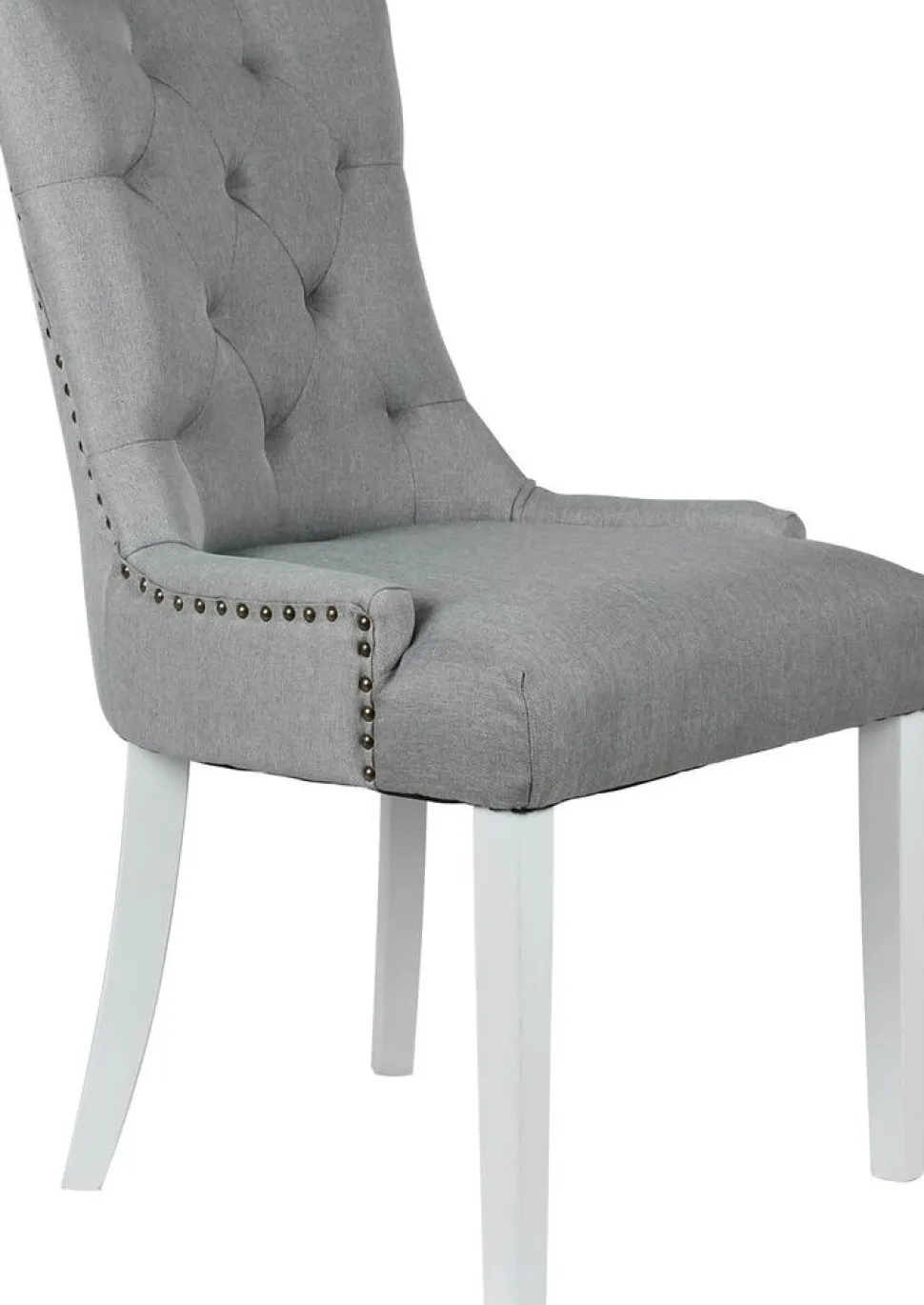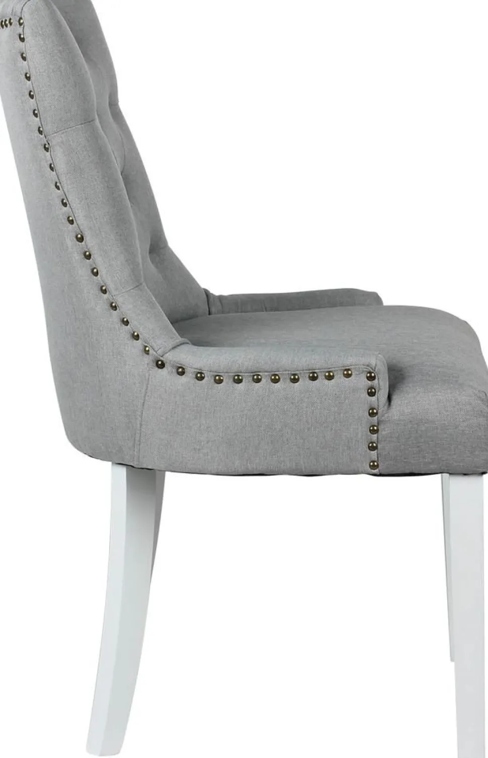 Tuva-stolen är en elegant och stilren matstol, klädd i ett trendigt grått tyg som ger en modern touch till din inredning. Med sina vita ben som står i kontrast till det mörka tyget skapar stolen en ljus och luftig känsla i rummet. Nitarna i antikfärg ger stolen en vacker detalj som inte bara är visuellt tilltalande utan också tillför en känsla av hantverk och karaktär.
