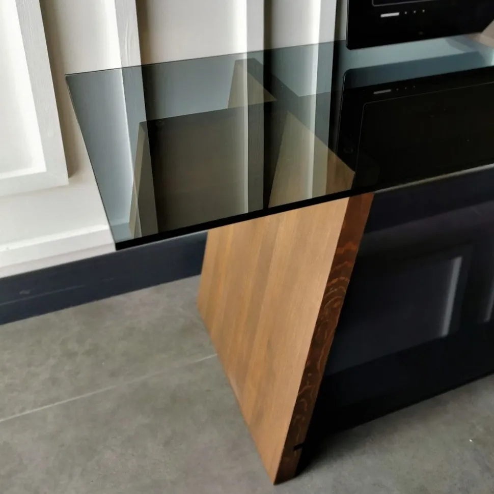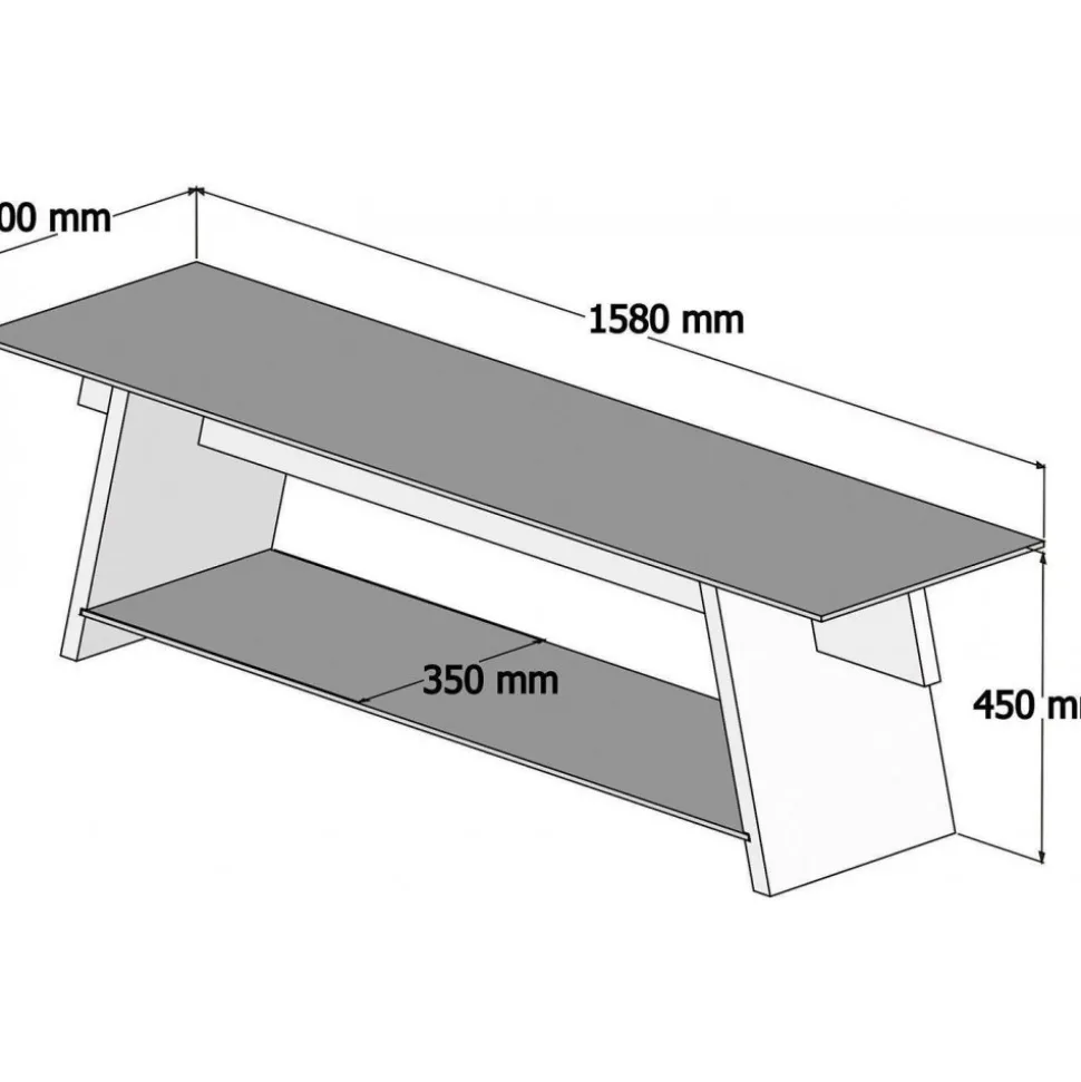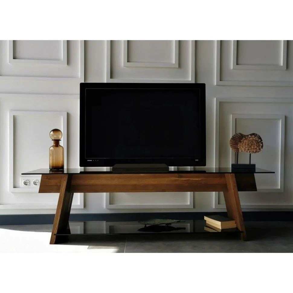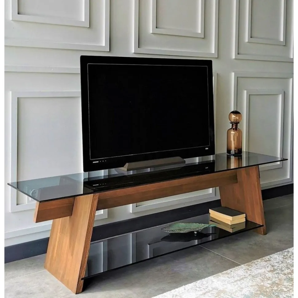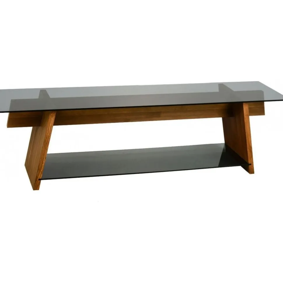 Mediabänk av trä och tempererat glas.