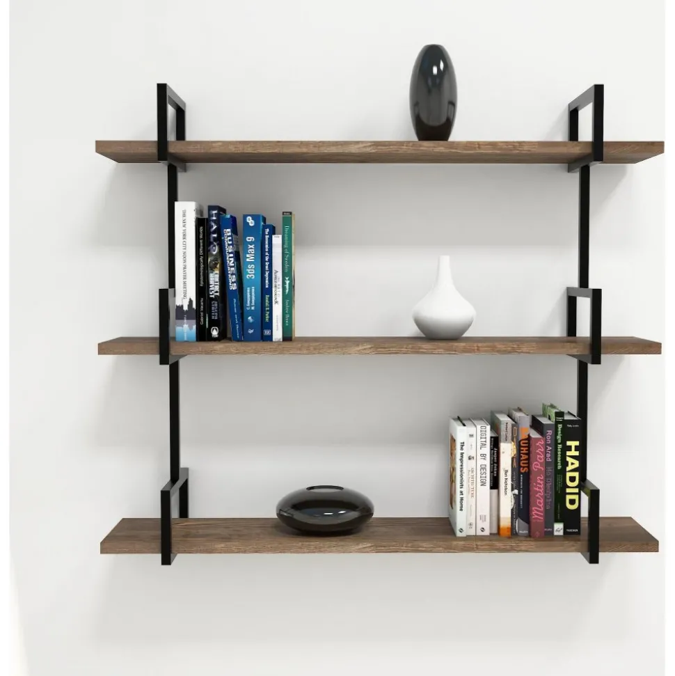 Vägghylla av trä och metall.