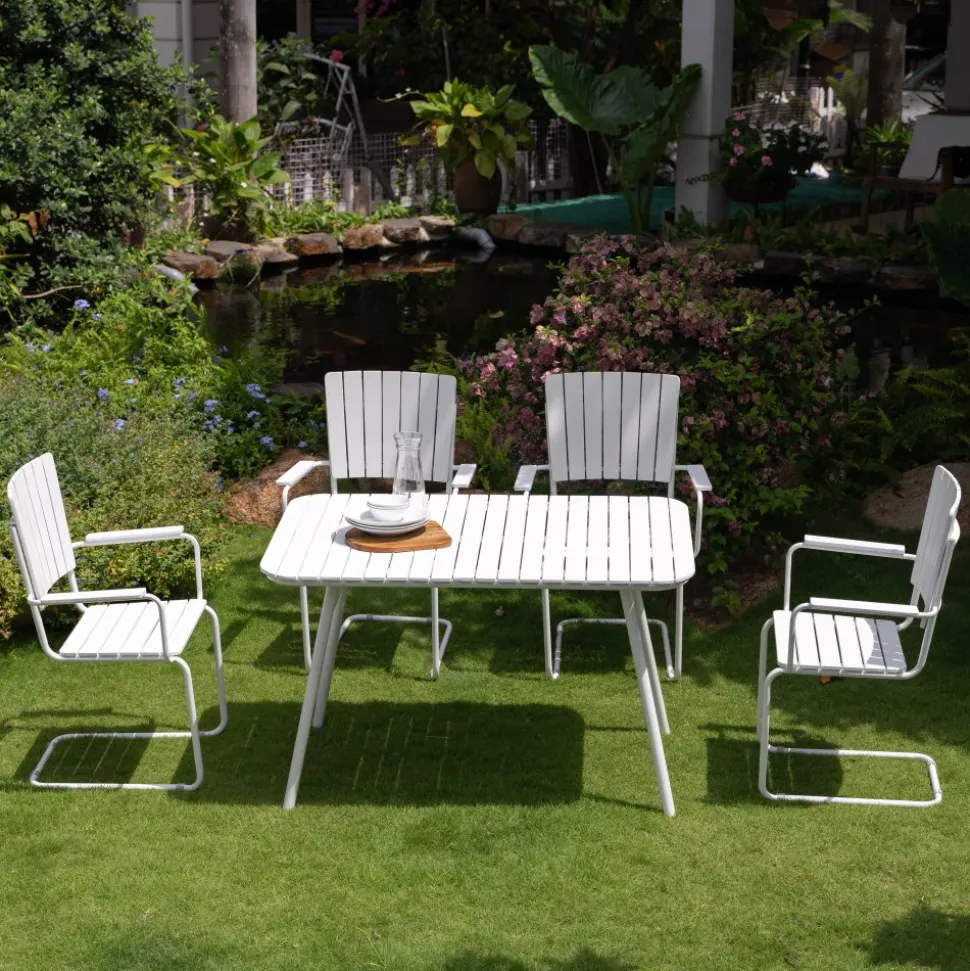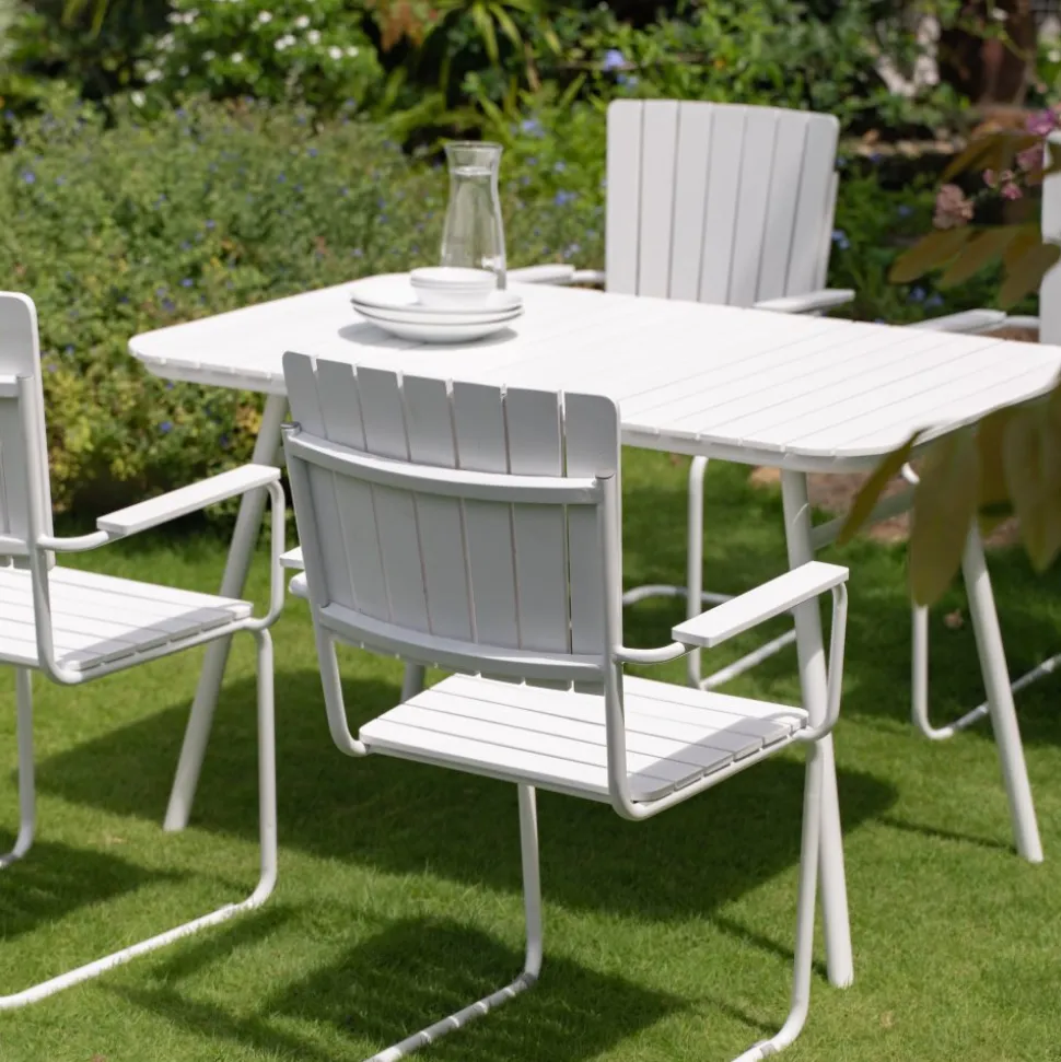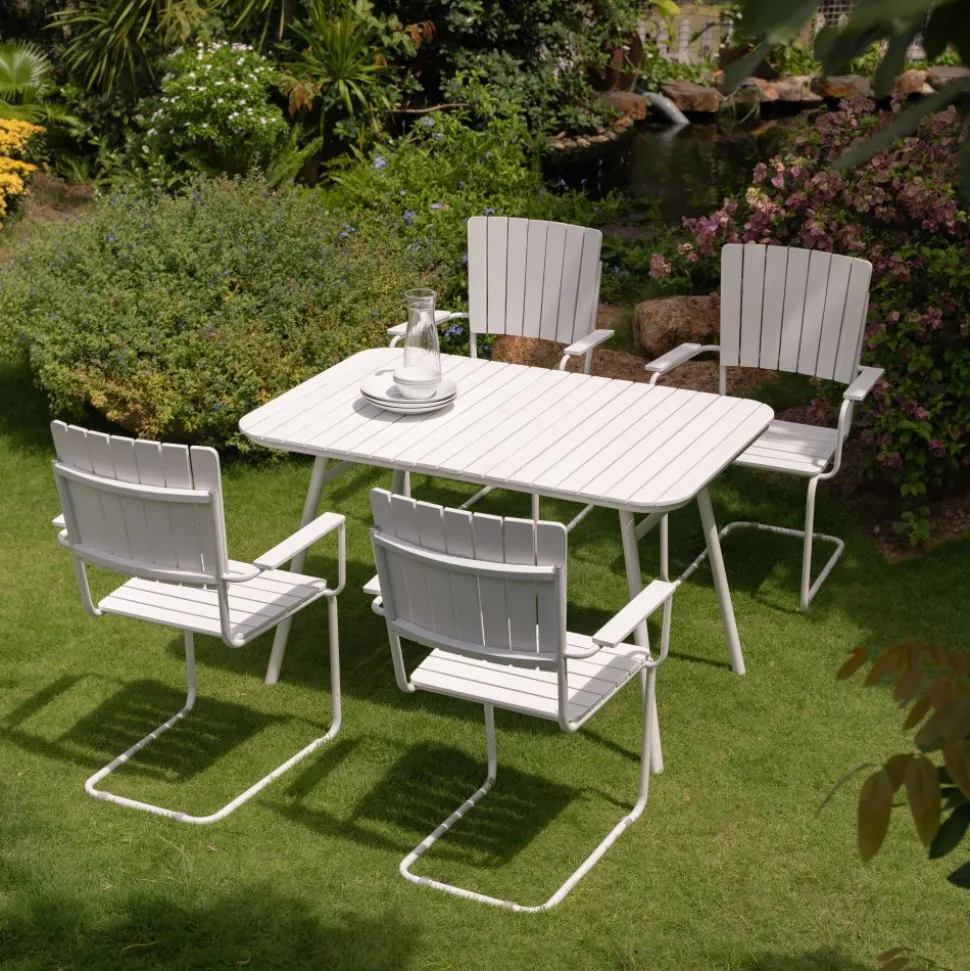 Utegruppen består av ett nätt rektangulärt bord 120×80 cm med tillhörande 4 st stolar.