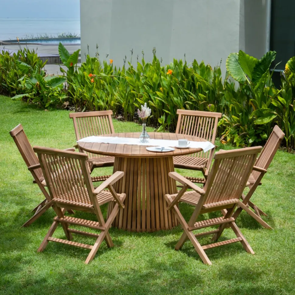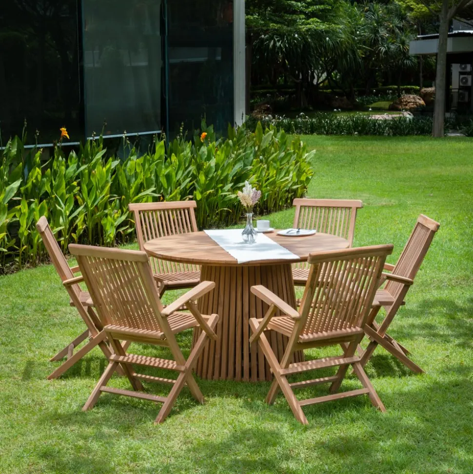 Saltö matgrupp för uteplatsen med ett runt matbord i massiv teak, tillsammans med sex stycken karmstolar i massiv teak. En klassisk kombination.