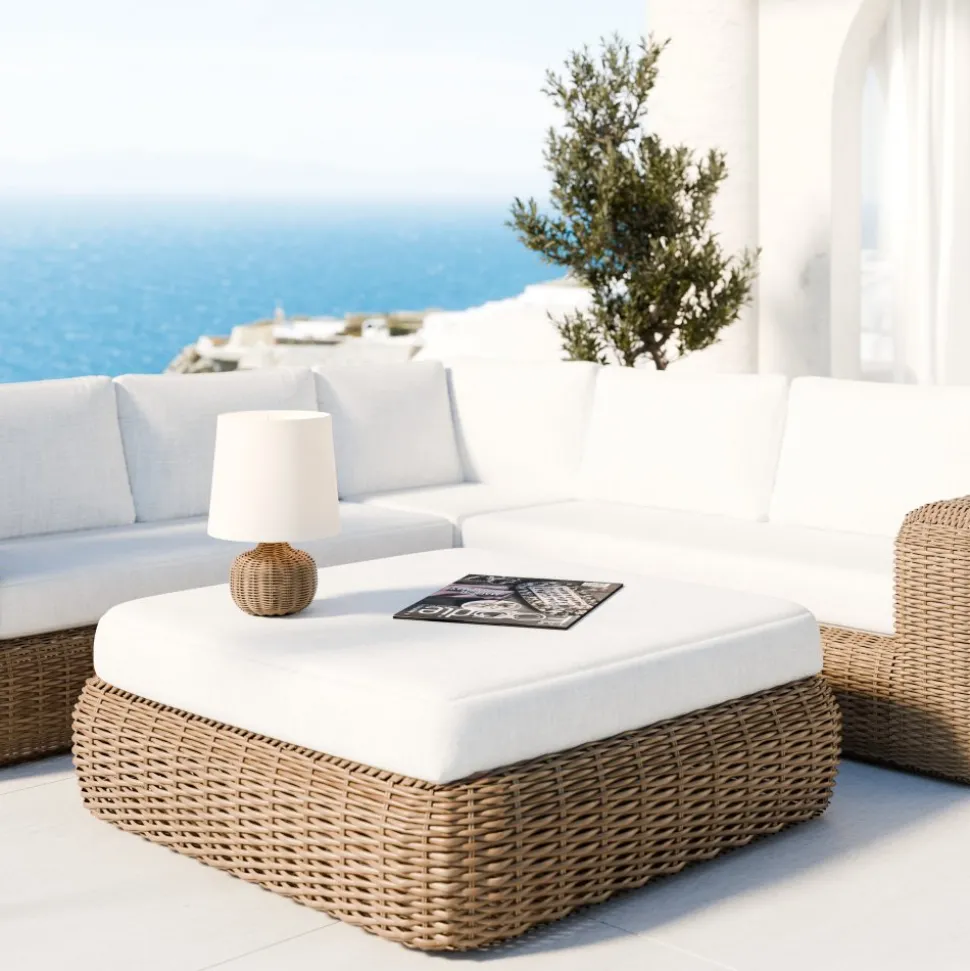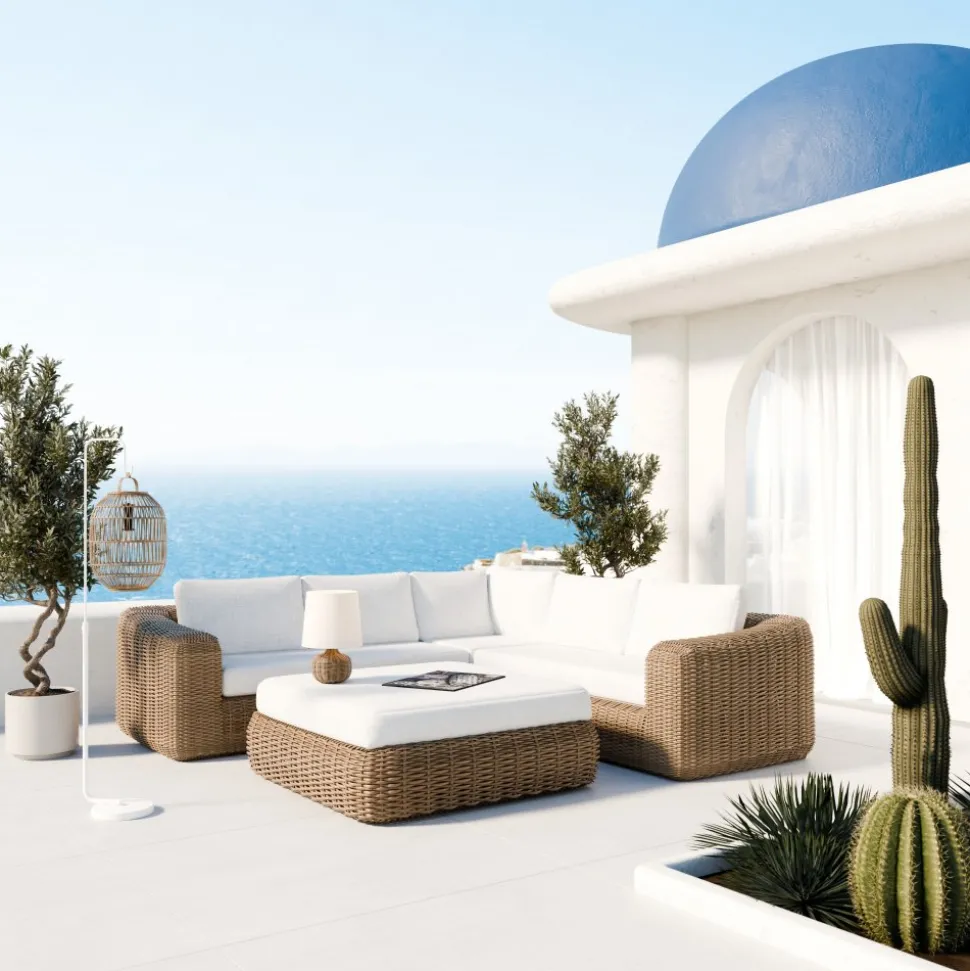 Soffgruppen är tillverkad av rund, naturfärgad konstrotting som ger en tidlös och elegant känsla. De extra tjocka sittdynorna i ljusbeige vädertåligt tyg ger en mjuk och behaglig sittupplevelse, samtidigt som de är anpassade för att klara utomhusbruk. St Tropez är det självklara valet för en stilfull och bekväm uteplats.