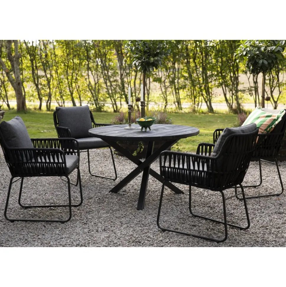Mikado matstol är en modern och komfortabel som passar lika bra som en lyxigare matstol utomhus. Den har en matt svartlackad metallstomme och vädertåligt antracitfärgat tyg som gör stolen både stilren och hållbar. Rygg och sits är utformade för att ge skön komfort, vilket gör stolen perfekt för långa, avkopplande stunder på uteplatsen eller vid matbordet i trädgården. De svarta repdetaljerna i rygg och sidor ger en exklusiv känsla och förstärker den moderna designen.
