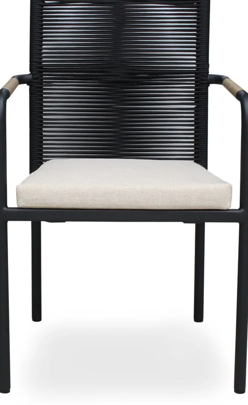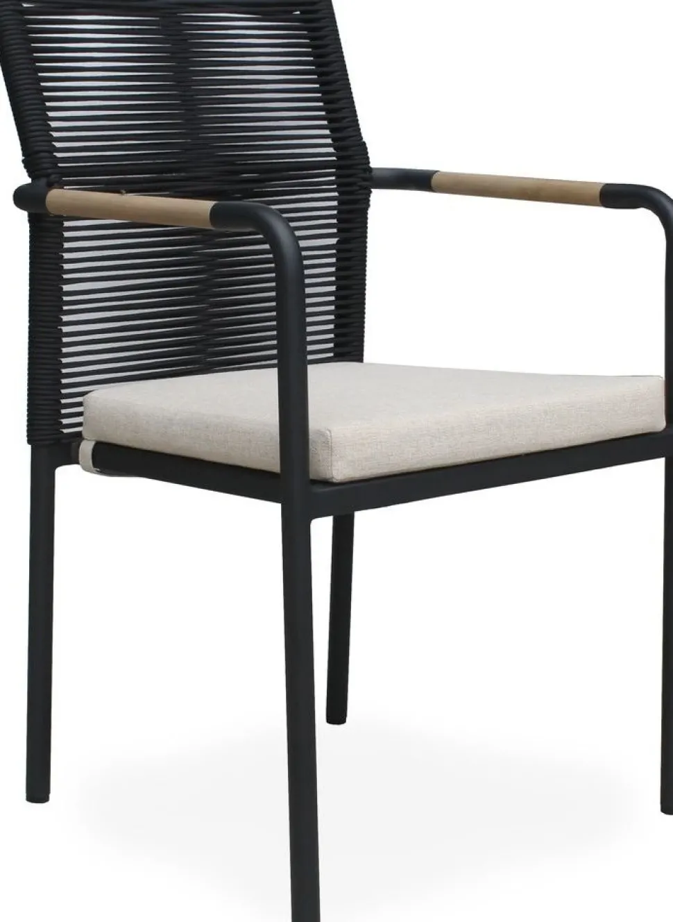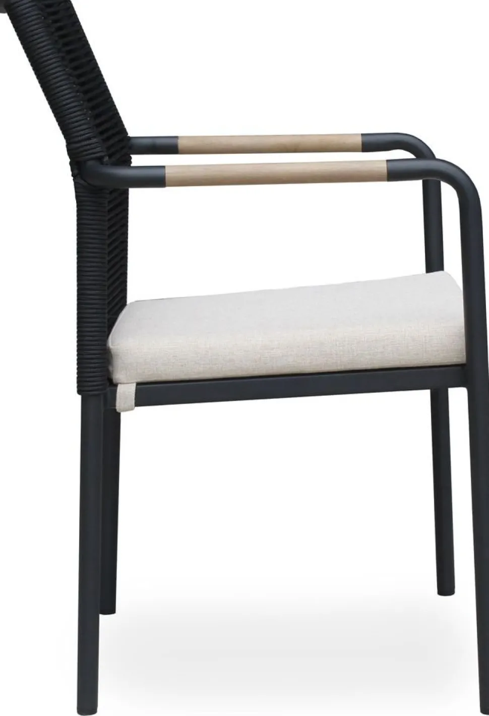 Skanör karmstol från Skånska Möbelhuset med flätad svart rygg, underrede av pulverlackerad svart aluminium. Sittdyna klädd med ett beige tyg som är anpassat för utemiljö, väderbeständigt och extra tåligt. Infällda inslag av teak i armstöden.