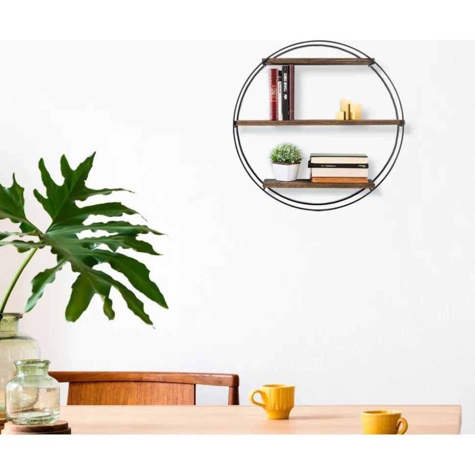 Svartlackad i metal med hyllplan i trä. Vägghyllan har tre stycken hyllplan för förvaring.