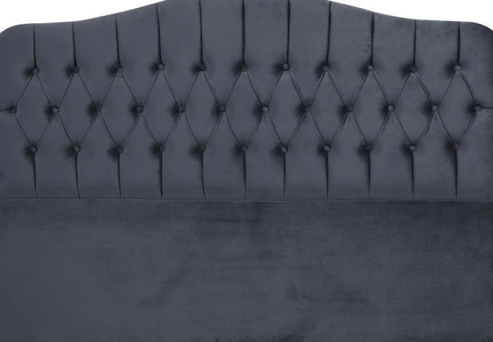 Sänggavel av trä med klädsel av tyg och stoppning av skum.