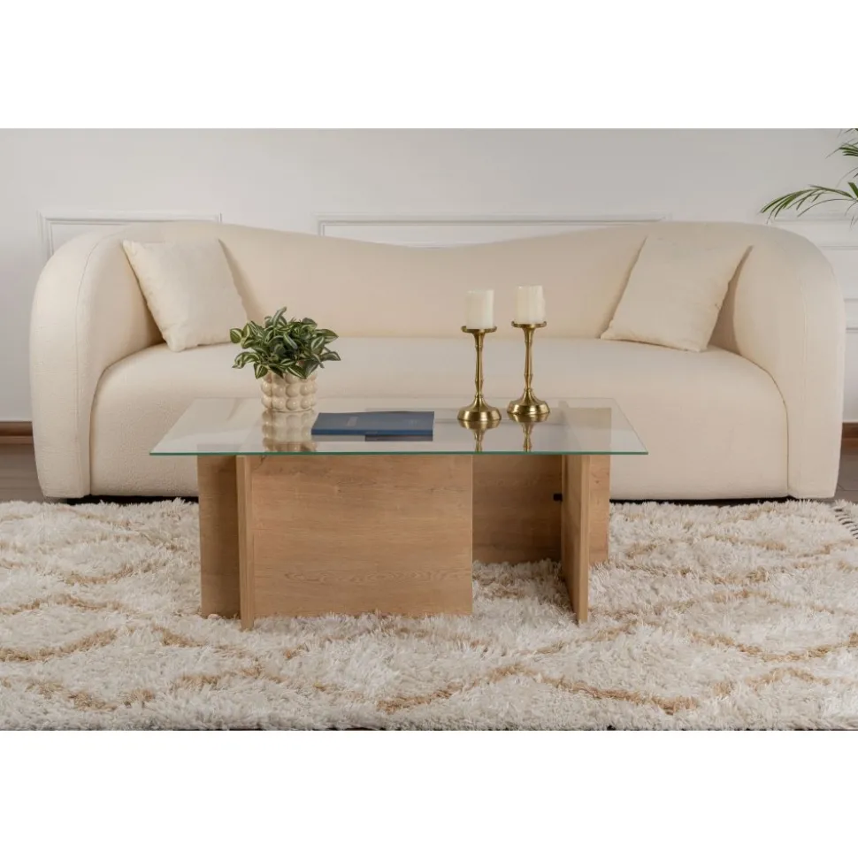 Vi presenterar vårt fantastiska ekfärgade soffbord, en möbel som kommer att lyfta stilen i alla med sin eleganta och moderna design. Detta är tillverkat av härdat glas och utstrålar sofistikering och elegans, vilket gör det till den perfekta mittpunkten i ditt hem.