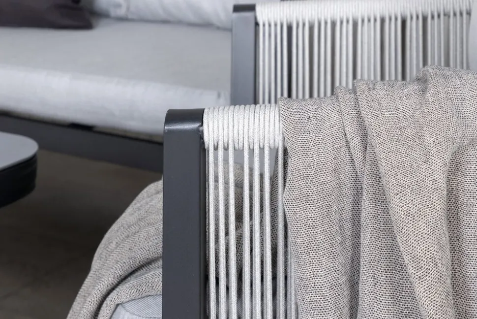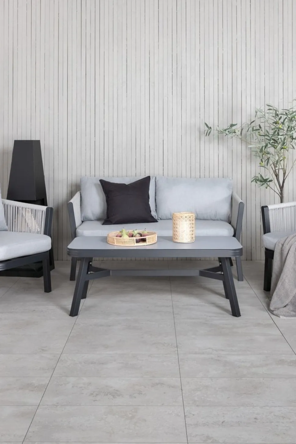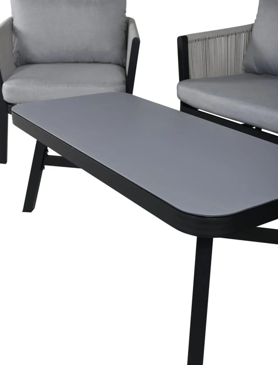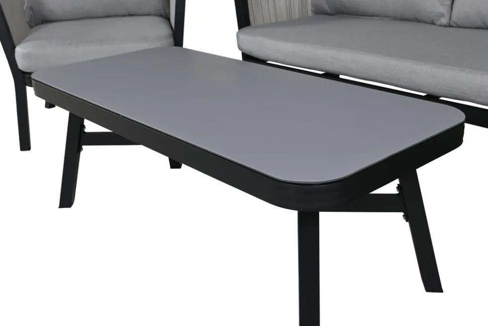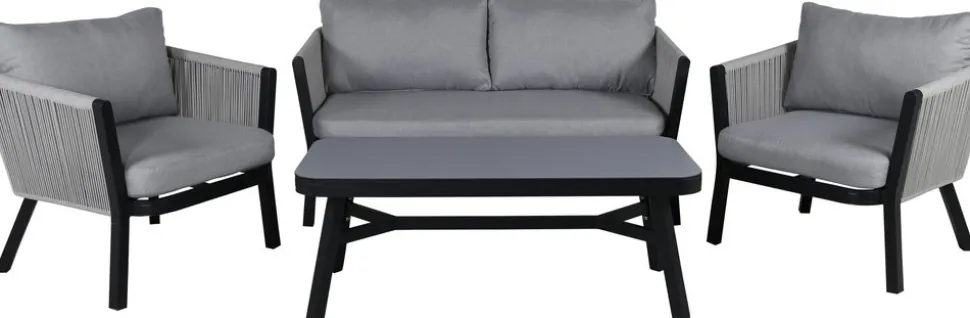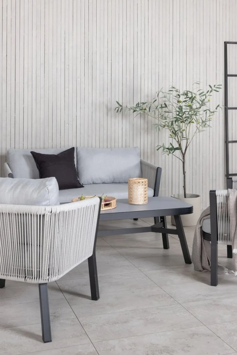 Virya är en modern med inriktning på komfort – den passar perfekt på uteplatsen eller altanen. Möbelgruppen består av en tvåsitssoffa, två karmfåtöljer tillverkad i svart pulverlackerad metall med en rygg som är designad i ljusgrått rep. Inkluderat i gruppen är ljusgrå mjuka dynor samt ett rektangulärt lågt soffbord med en bordsskiva i grå finish som matchar repen och dynornas nyans och skapar en exklusiv helhet. Njut av bekväma sommarkvällar i en trivsam soffgrupp! Skötselråd: Våra rep är kvalitetsspunna polyesterrep som är lätta att rengöra. Möblerna är behandlade för att klara 500-2000 timmar. Vi rekommenderar såpa och vatten för rengöring. Låt lufttorka.