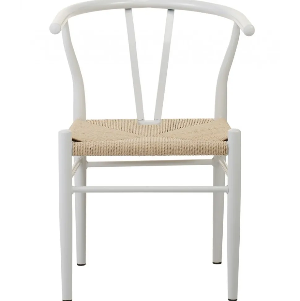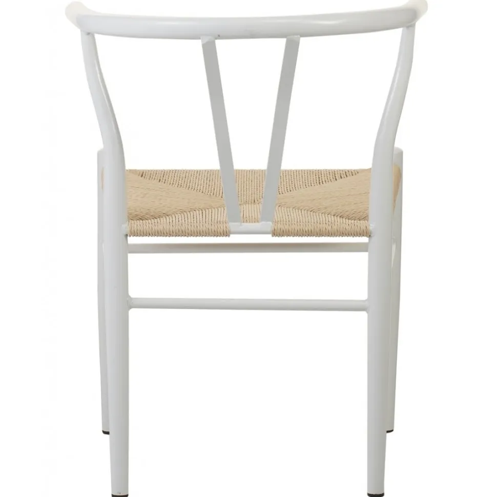 Denna snygga med klassisk design är tillverkad av lackad vit metall, vilket ger den ett stilrent och tidlöst utseende. Det slitstarka repsitset ger en unik textur och bra sittkomfort, vilket gör att stolen passar perfekt för både vardagsbruk och festligare tillfällen.
