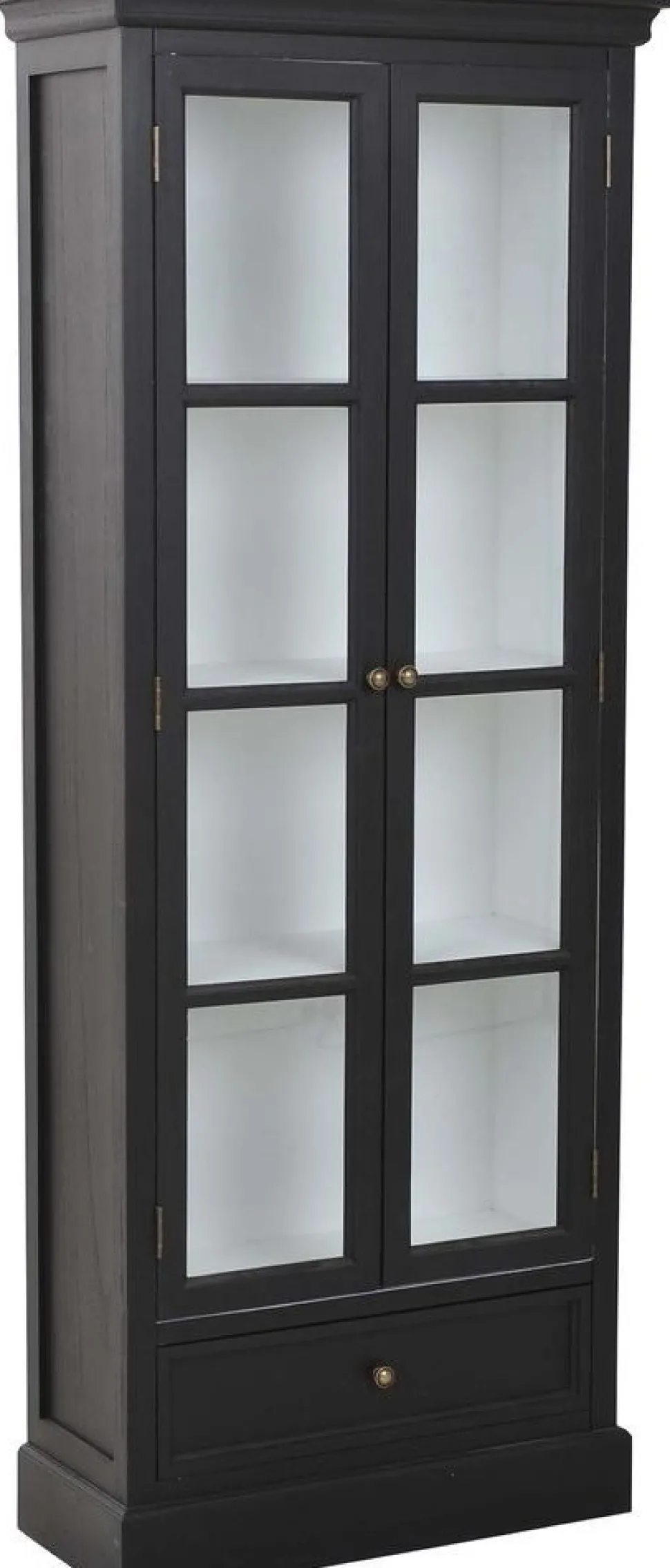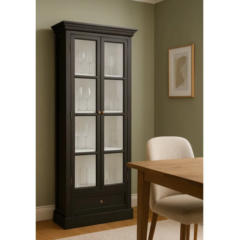 Robust i svart med 2 dörrar i glas, vit insida av skåpet. Skåpet har 1 låda nertill.
