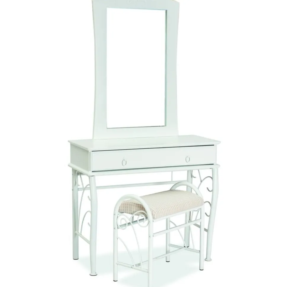 Ett snyggt sminkbord med en klassisk design. Stommen är tillverkad av vitlackerad metall och bordet är av vitlackerad MDF med stor låda för förvaring och spegel. Pallen ingår i köpet och är av vitlackerad metall med klädsel av mycket behagligt tyg för maximal komfort.