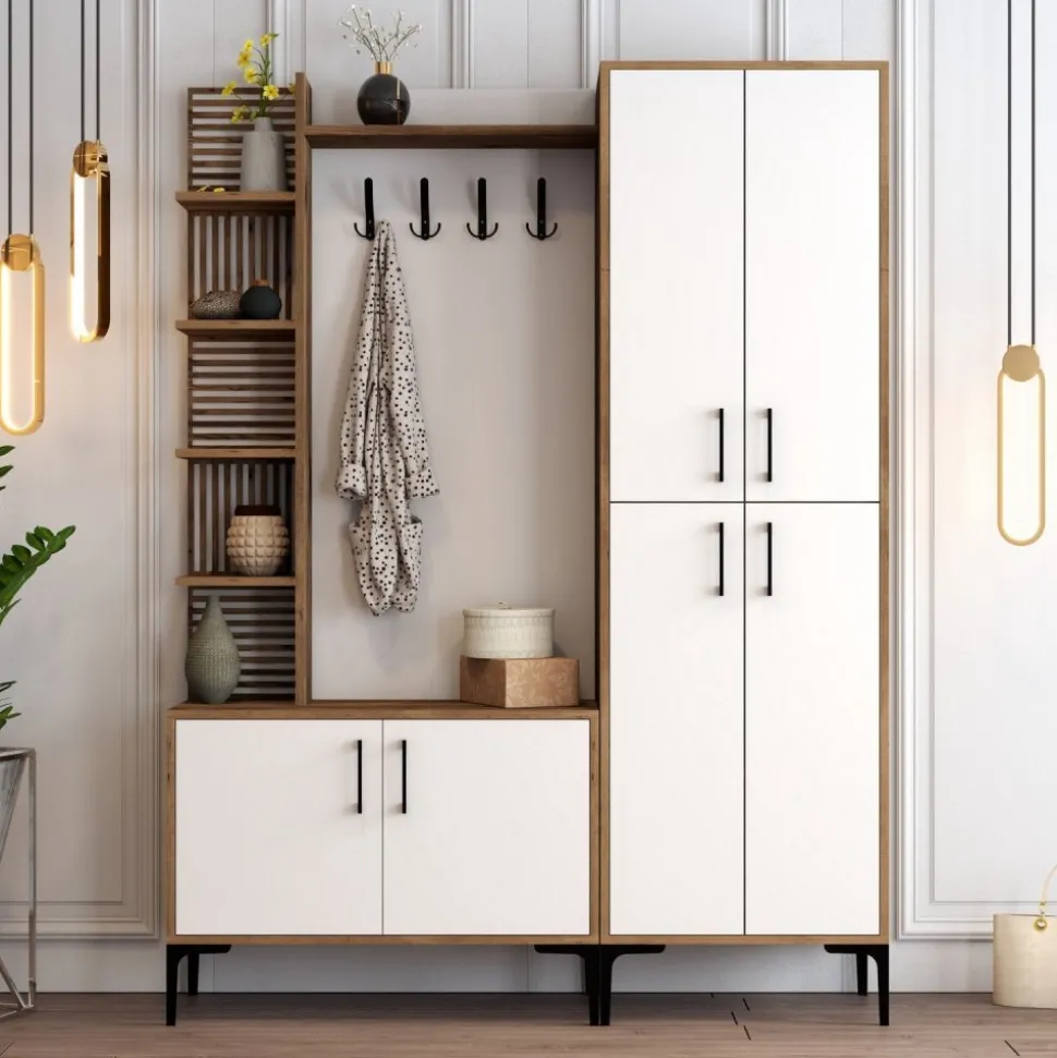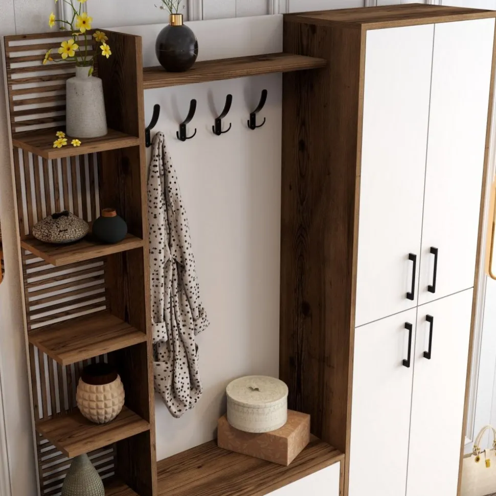 Hallmöbel av trä och metall.