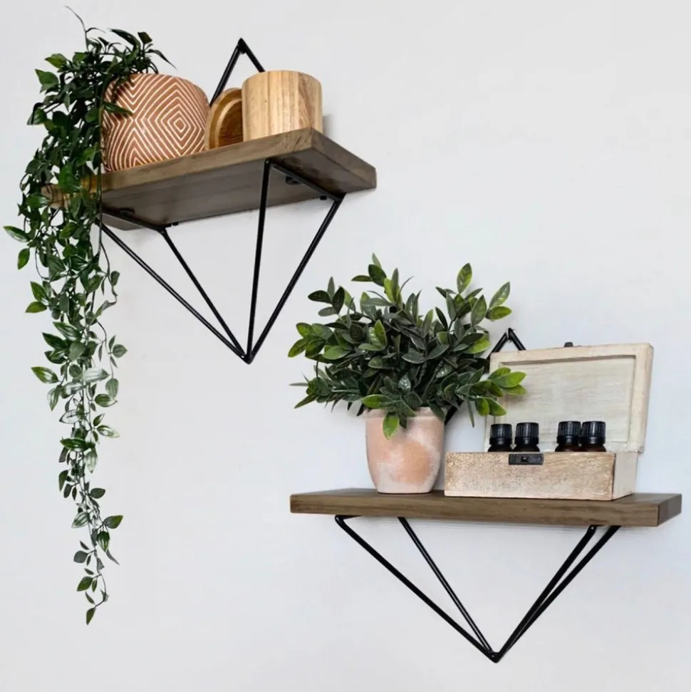 Vägghylla av trä och metall.