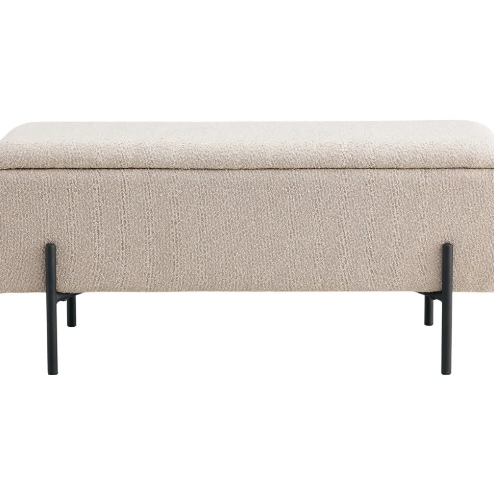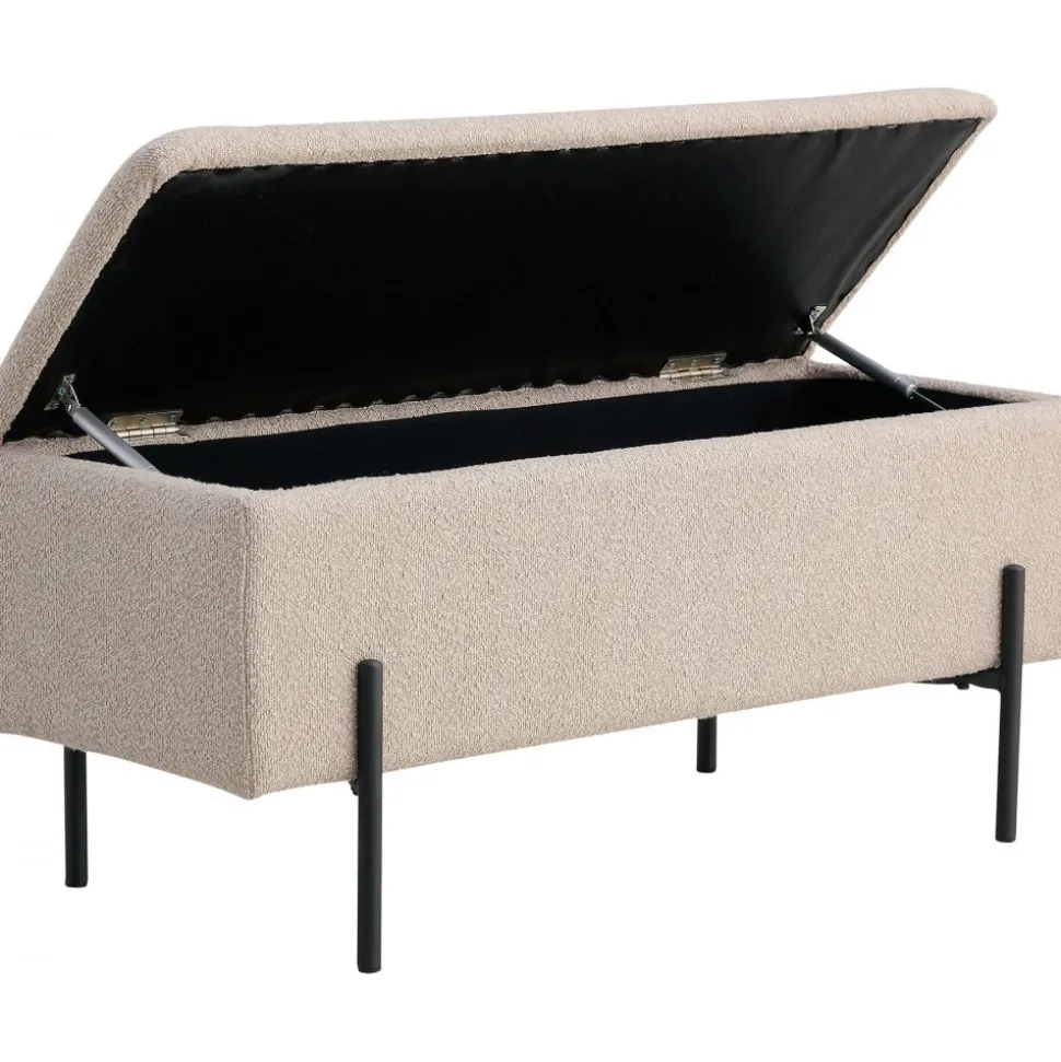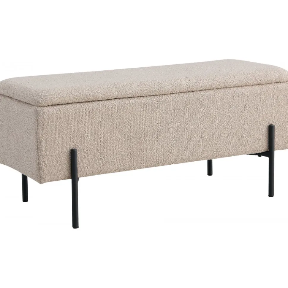 Sittbänk av plywood med klädsel av polyester och ben av metall. Levereras omonterad.