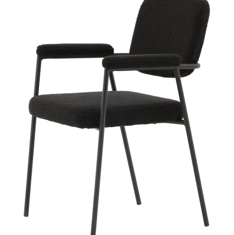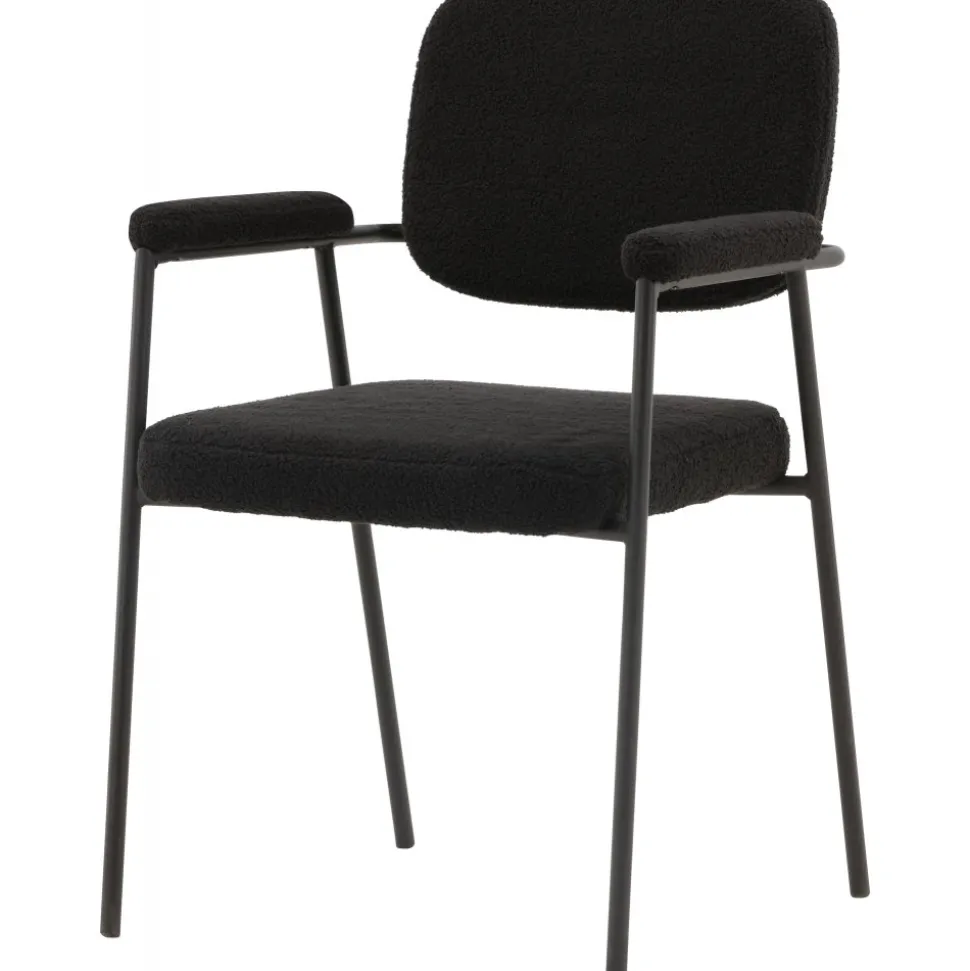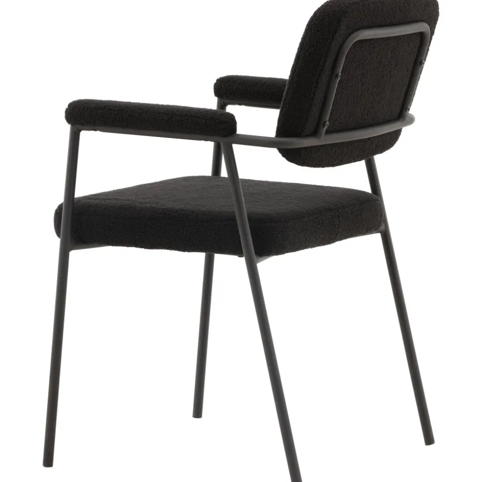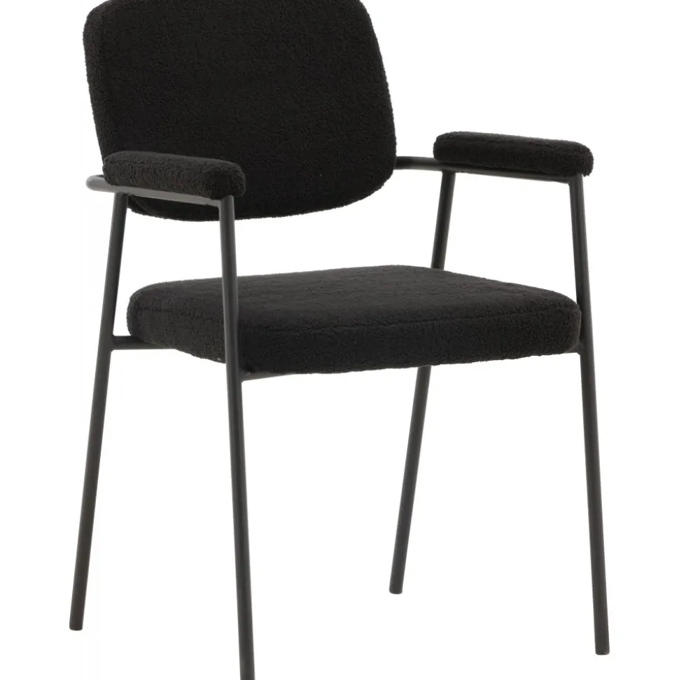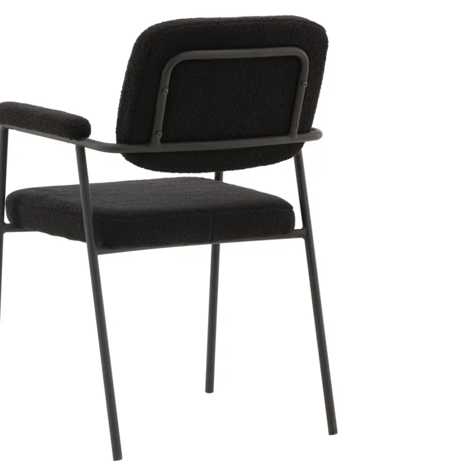 Läcker i skandinavisk design som har en helklädd sits i svart bouclétyg och smala stolsben med integrerade armstöd i svart metall. Den mjuka sitsen är stoppad för extra komfort och bjuder in till långa trivsamma middagsstunder. Matcha med ett snyggt matbord så får du en komplett matgrupp till hemmets hjärta!