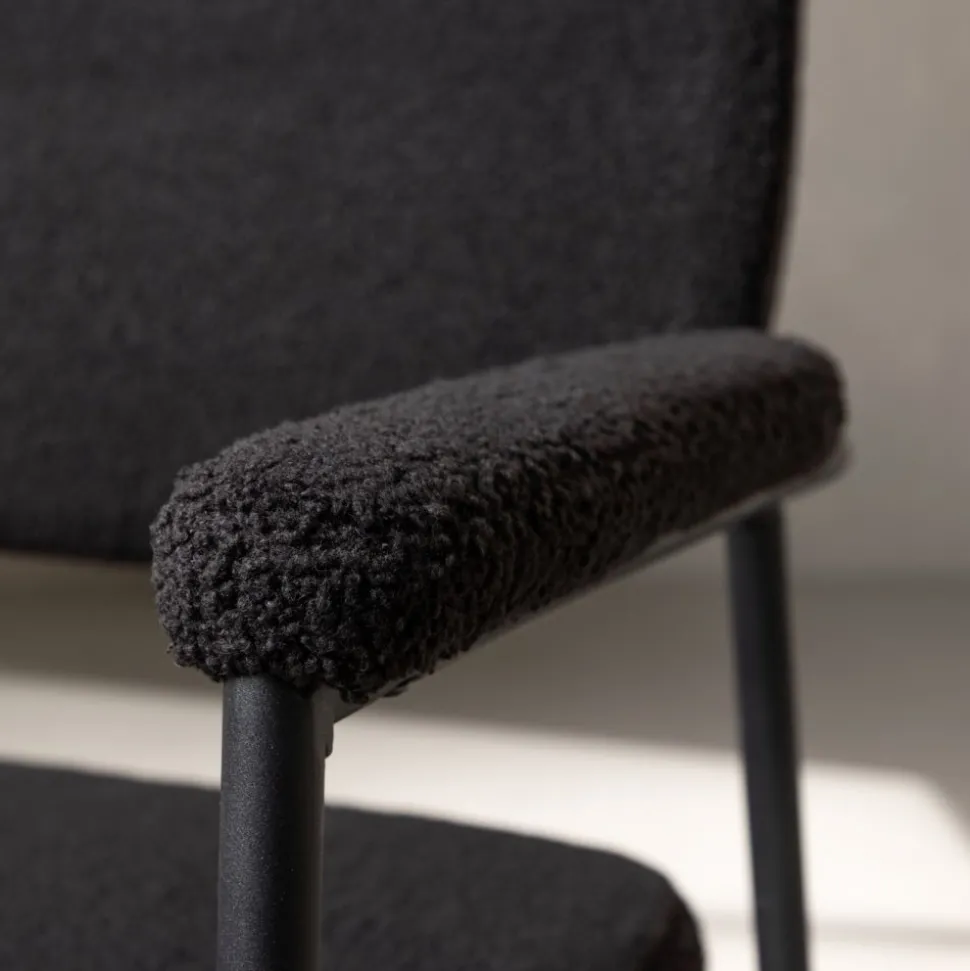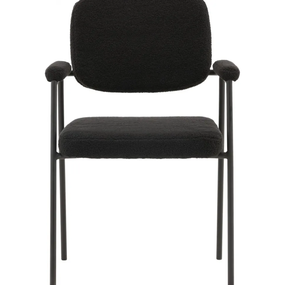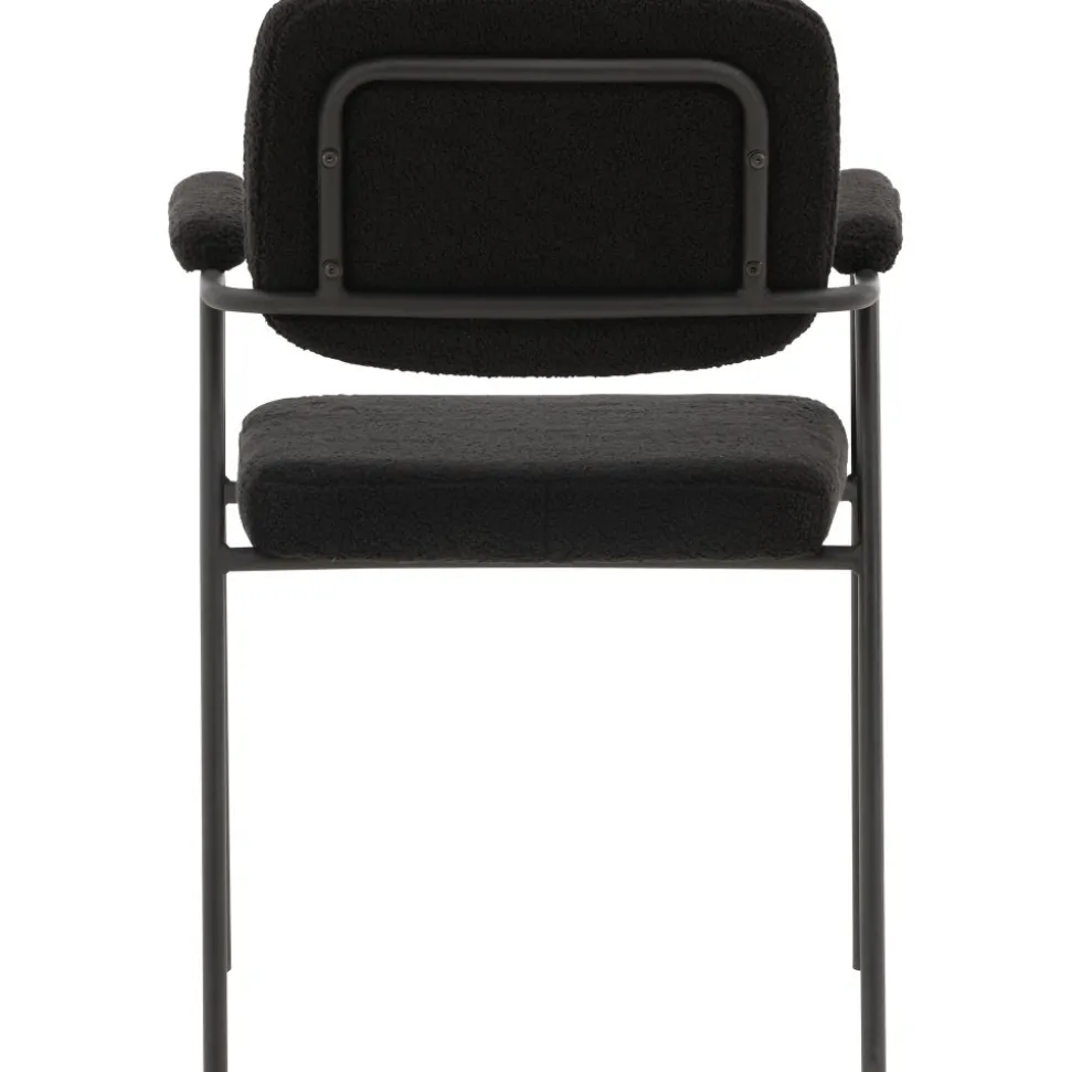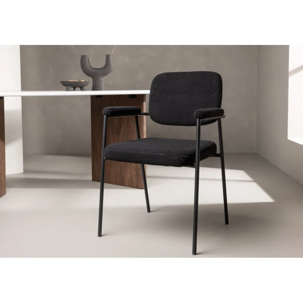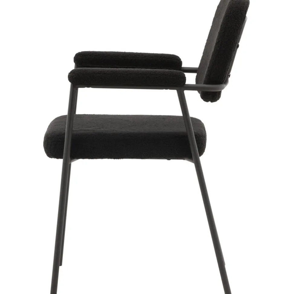 Läcker i skandinavisk design som har en helklädd sits i svart bouclétyg och smala stolsben med integrerade armstöd i svart metall. Den mjuka sitsen är stoppad för extra komfort och bjuder in till långa trivsamma middagsstunder. Matcha med ett snyggt matbord så får du en komplett matgrupp till hemmets hjärta!
