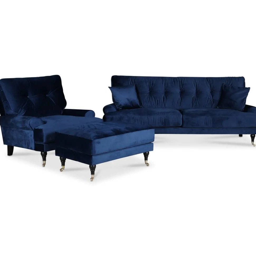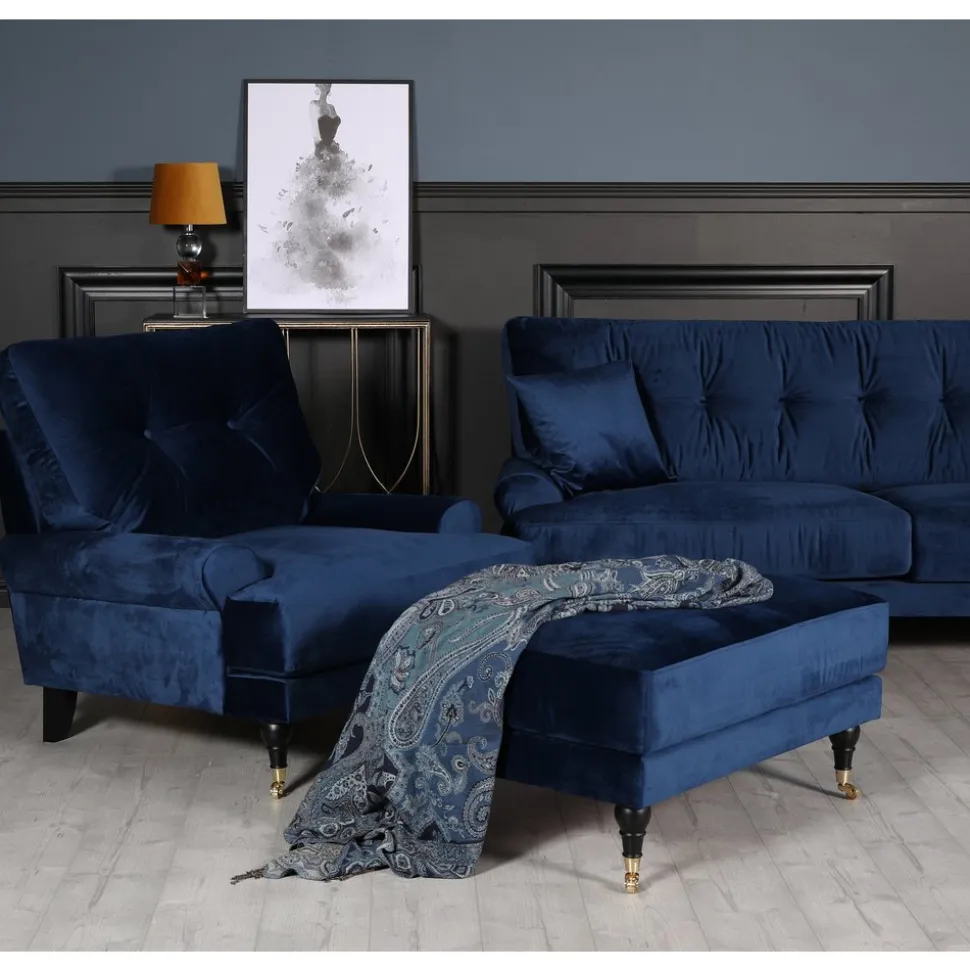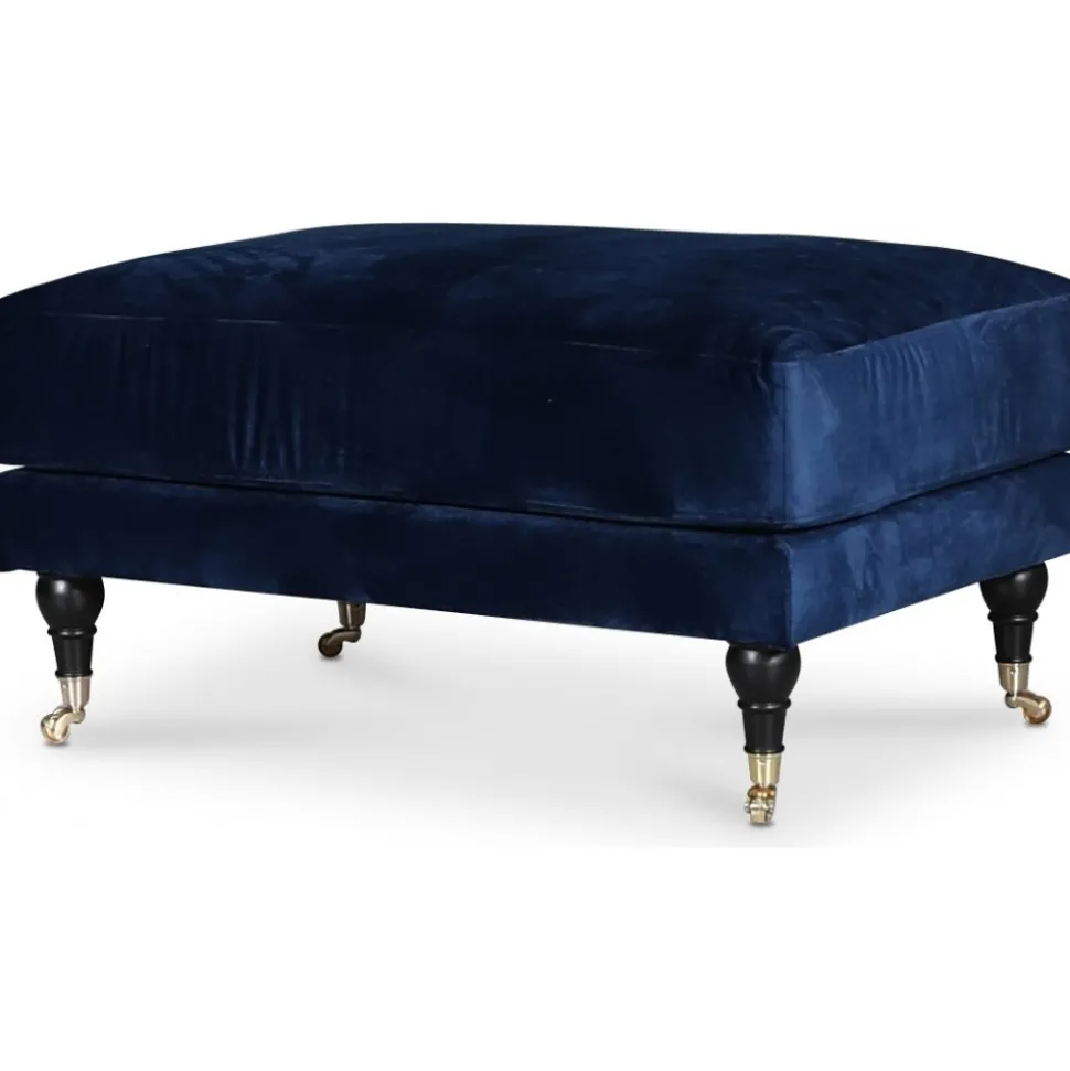 Fotpallen finns i ett midnattsblått mjukt sammetsliknande tyg. Benen är svarta med mässingsfärgade hjul.