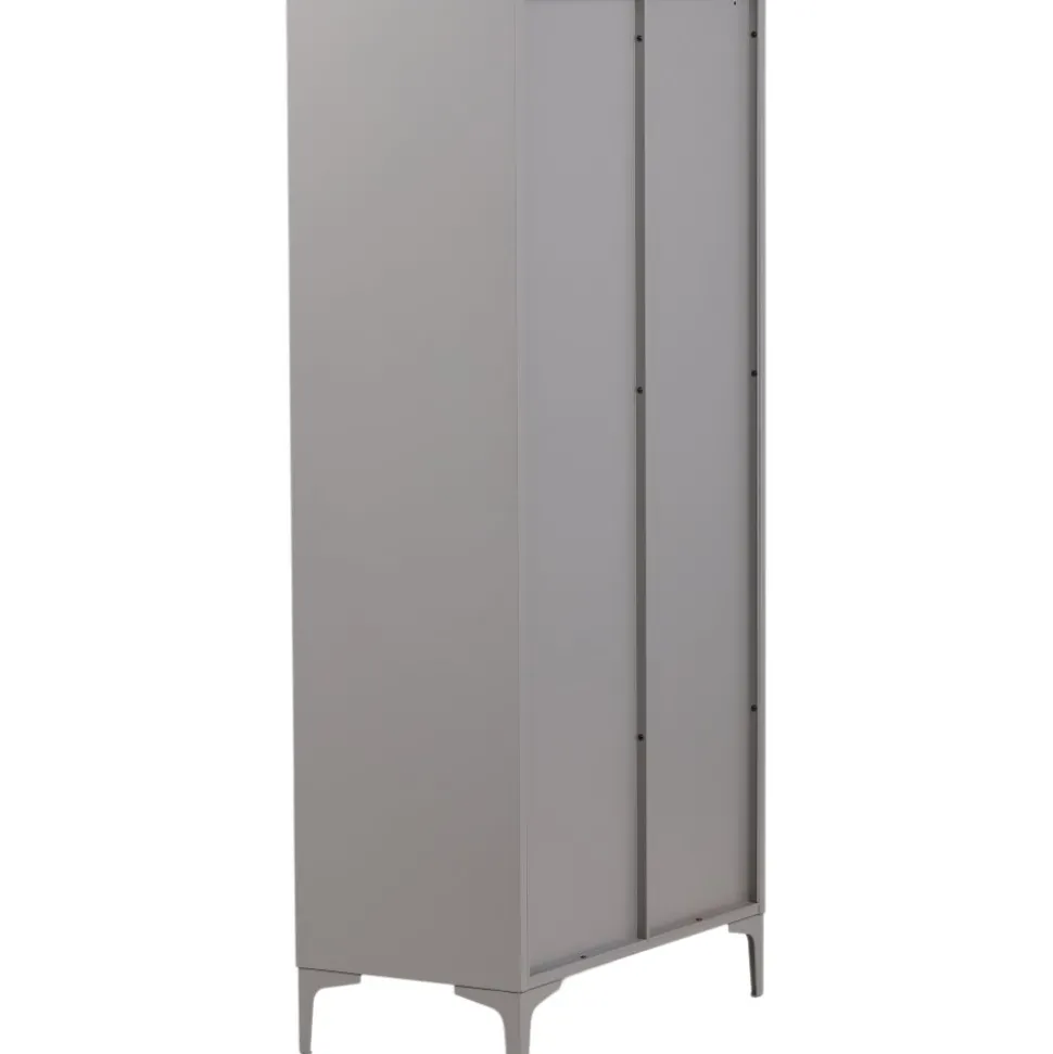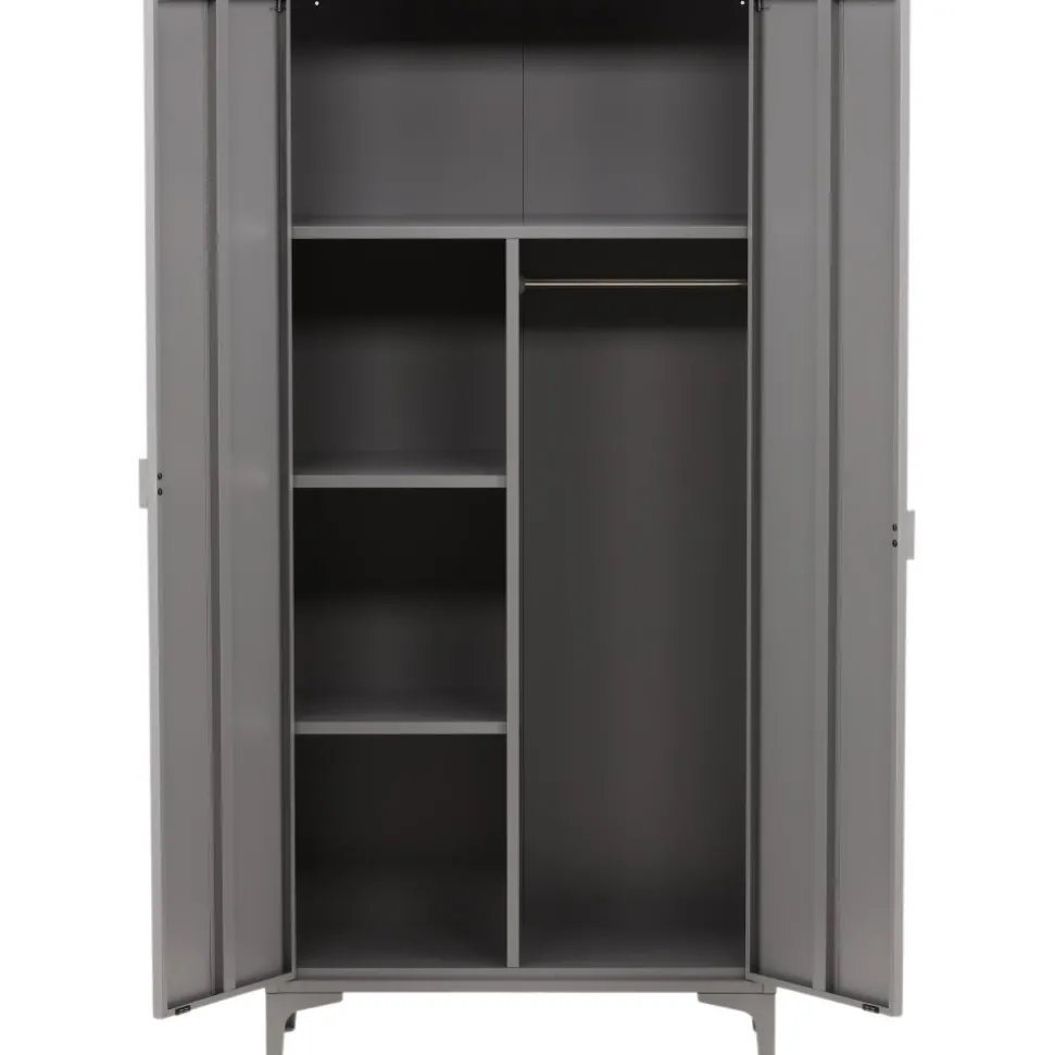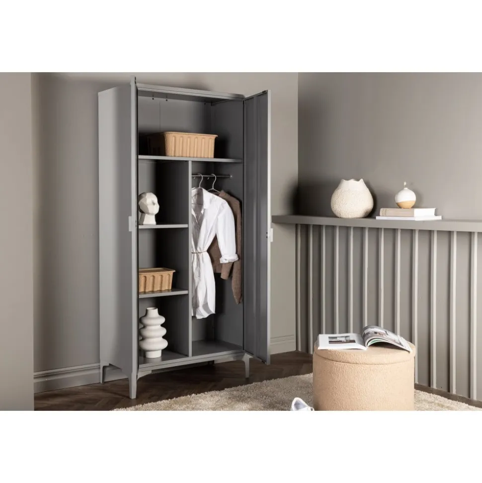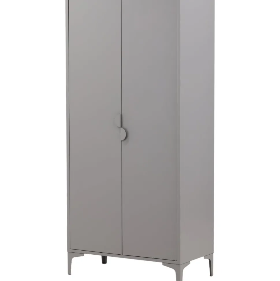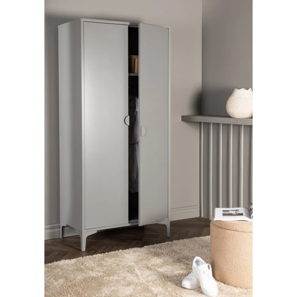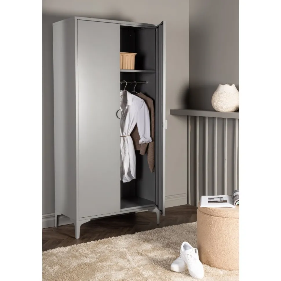 Garderoben från serien Alexander är det perfekta tillskottet till sovrummet. Den här höga garderoben i grått stål har två dörrar som öppnar upp till fyra hyllplan och rymmer även plats för hängare så att de nystrukna kläderna slipper skrynklas. Alexander lyfts upp av fyra nätta ben som skapar ett luftigt intryck och underlättar också för dammsugaren. Investera i mer förvaringsyta till dig själv och få en snygg möbel i ditt hem på köpet.