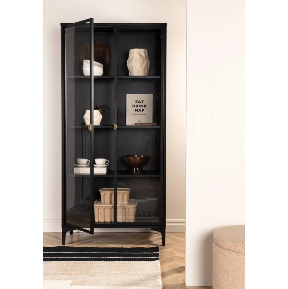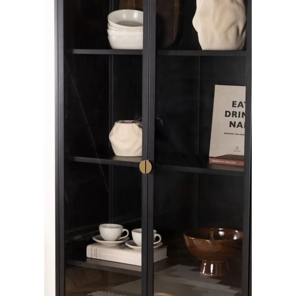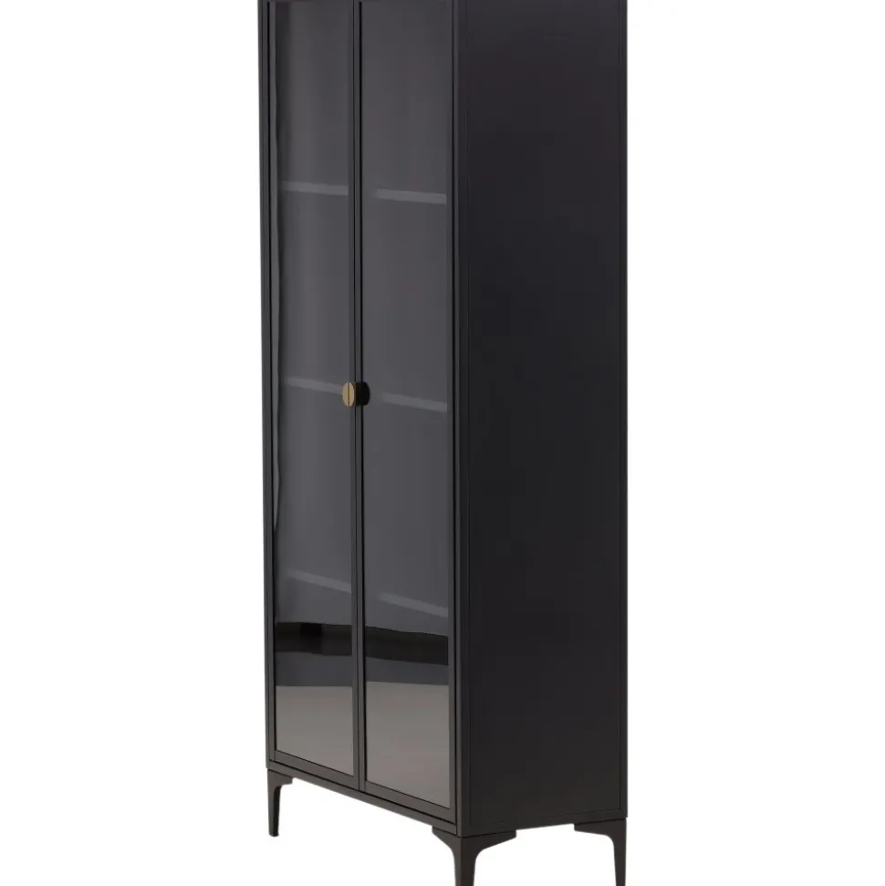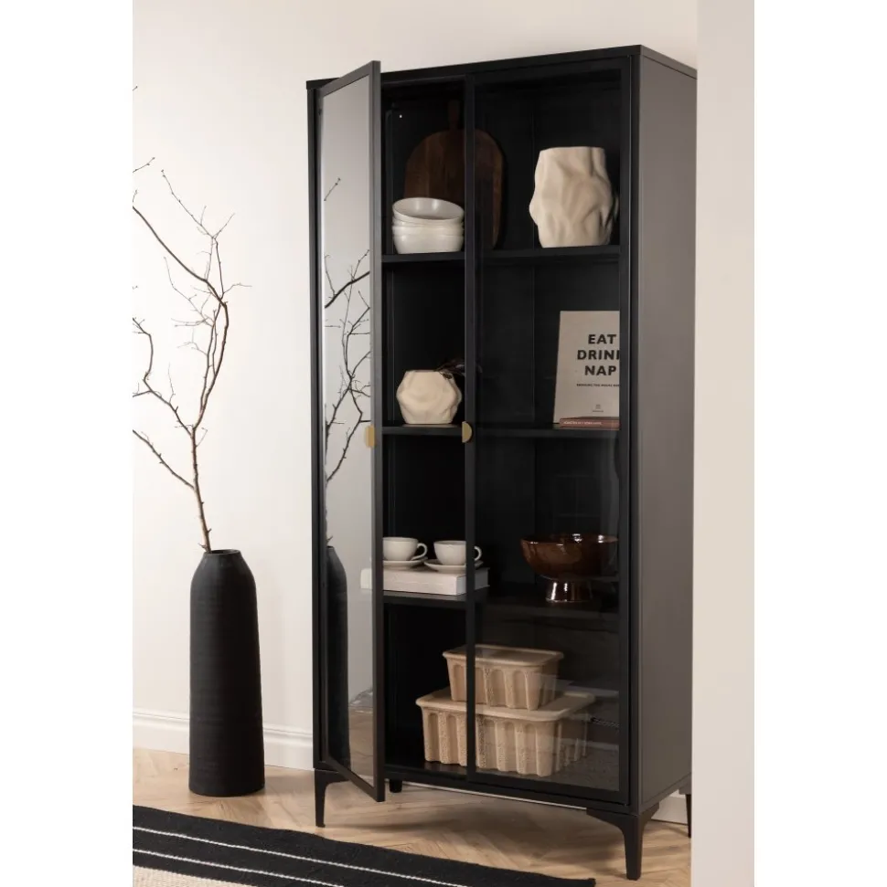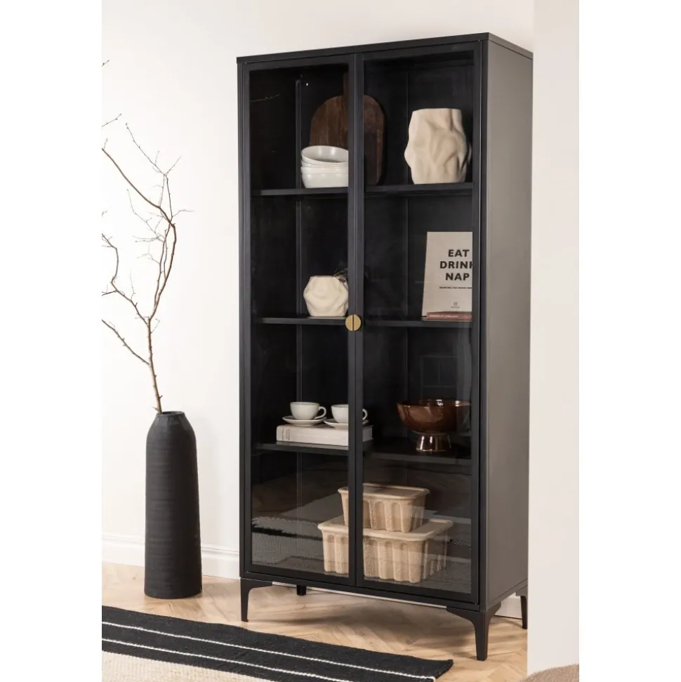Vitrinskåpet är ett populärt tillskott till inredningen med eleganta förvaringsmöjligheter. Skåpet från serien Alexander har en modern design med raka strukturer, tillverkad i pulverlackerat svart stål. Skåpet har två höga dörrar i glas som ger härligt ljusinsläpp i skåpet och fyra avlastningsytor för ditt finporslin eller vackra inredningsdetaljer. Det här är ett som erbjuder det bästa av två världar helt enkelt – välj vad du vill visa upp och vad som behöver smart förvaring. Lättare montering krävs.