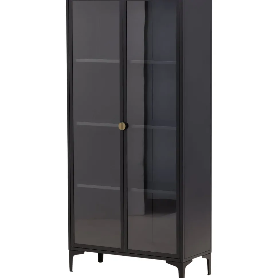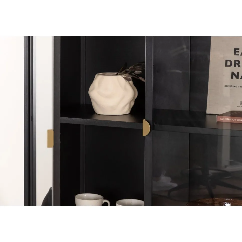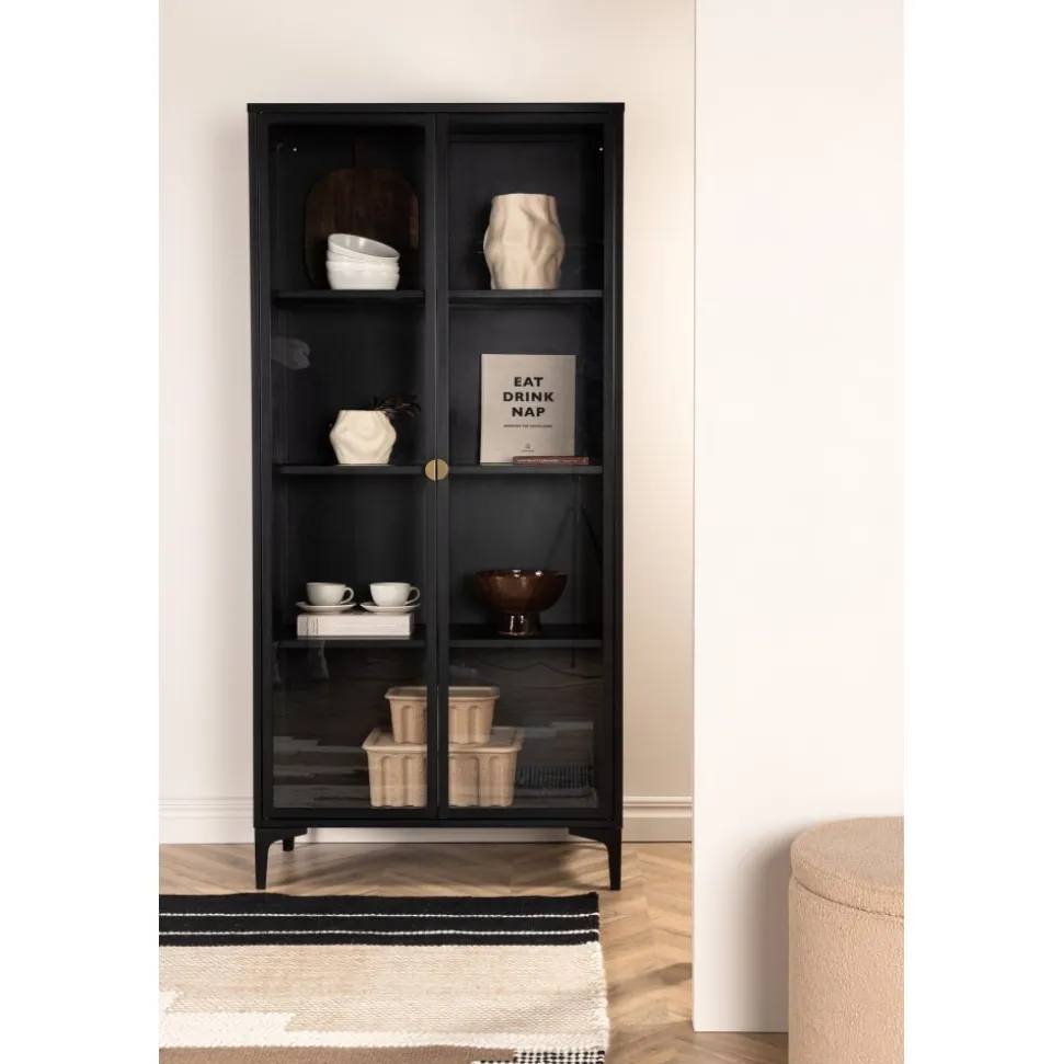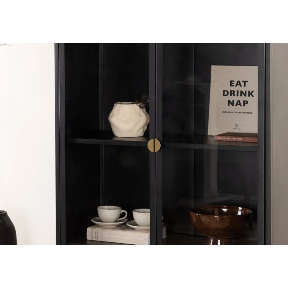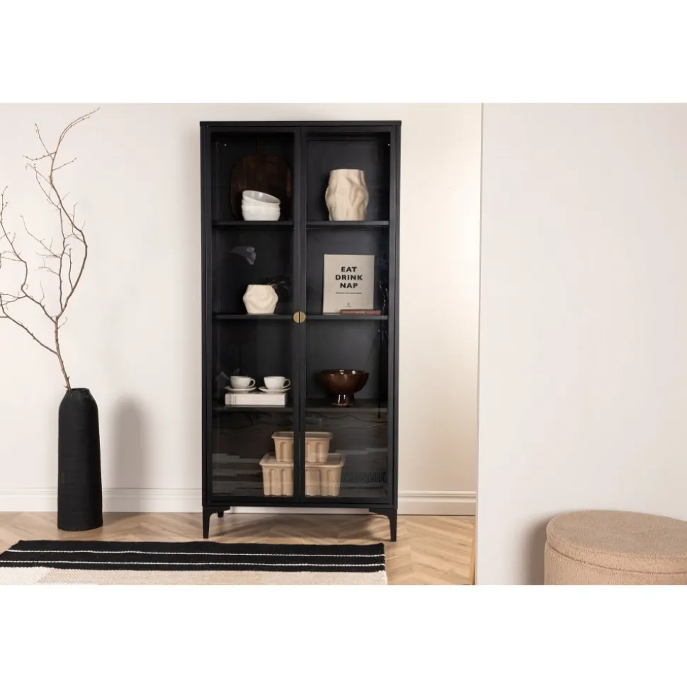 Vitrinskåpet är ett populärt tillskott till inredningen med eleganta förvaringsmöjligheter. Skåpet från serien Alexander har en modern design med raka strukturer, tillverkad i pulverlackerat svart stål. Skåpet har två höga dörrar i glas som ger härligt ljusinsläpp i skåpet och fyra avlastningsytor för ditt finporslin eller vackra inredningsdetaljer. Det här är ett som erbjuder det bästa av två världar helt enkelt – välj vad du vill visa upp och vad som behöver smart förvaring. Lättare montering krävs.