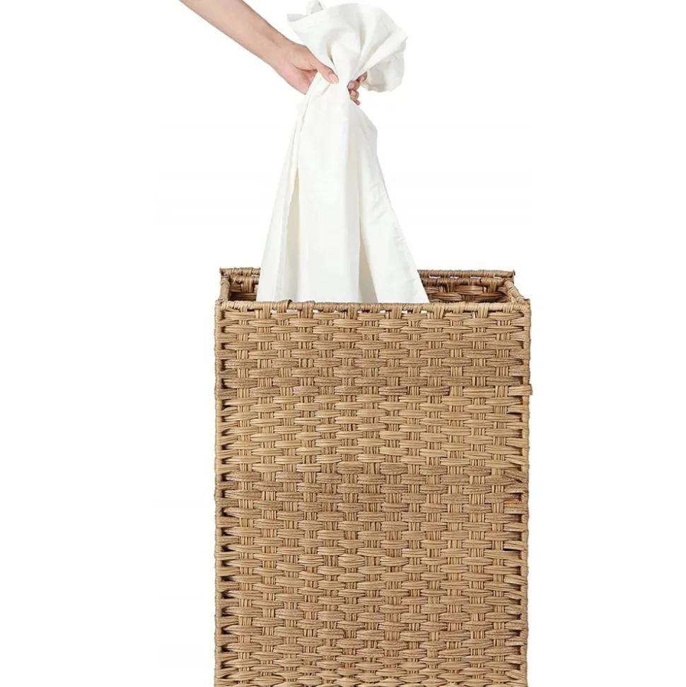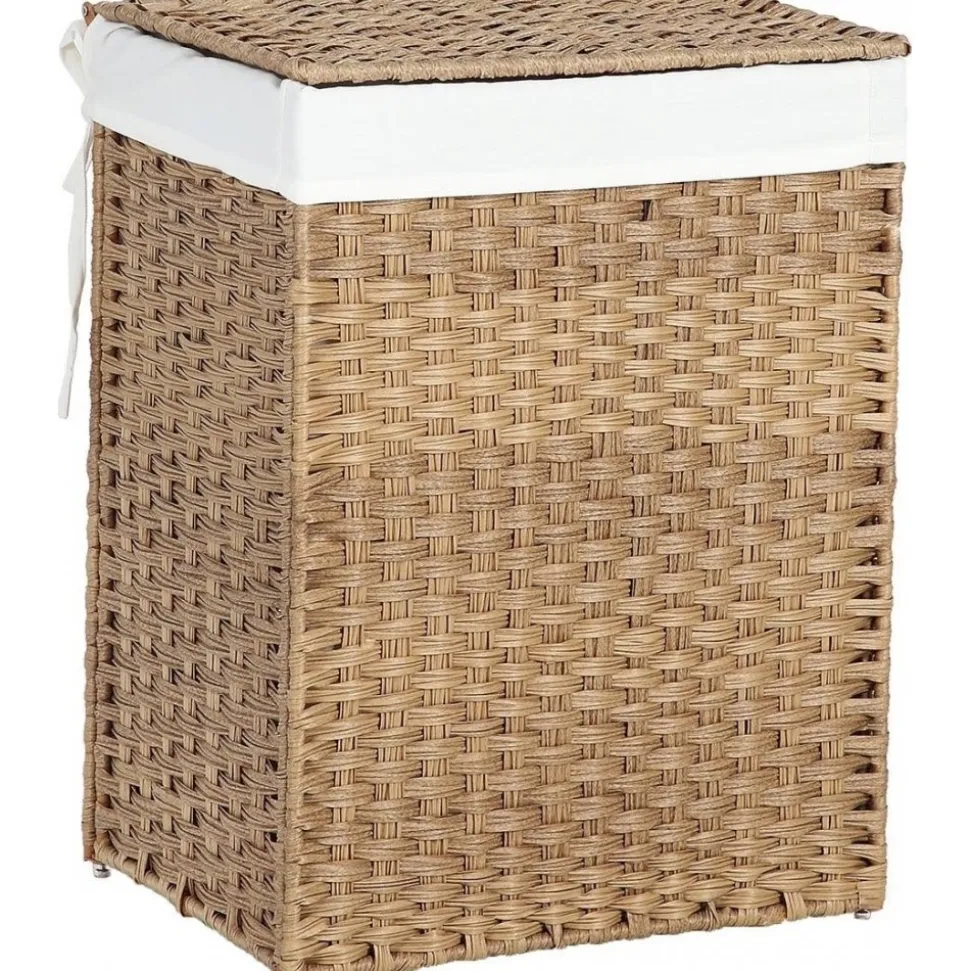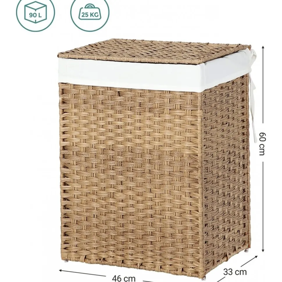 Tvättkorg av konstrotting och järn. Innerpåse av bomull som rymmer 90 liter.