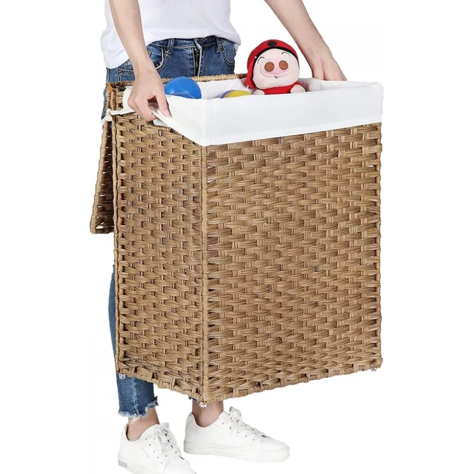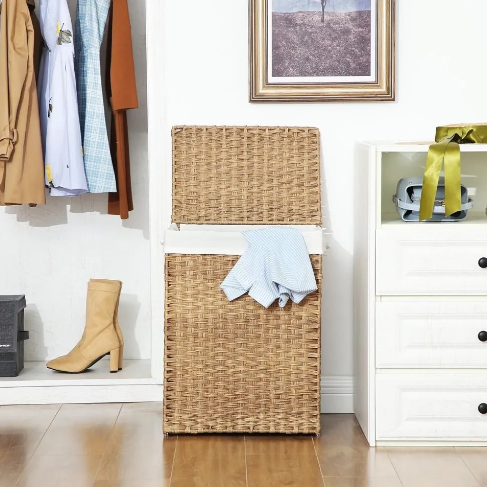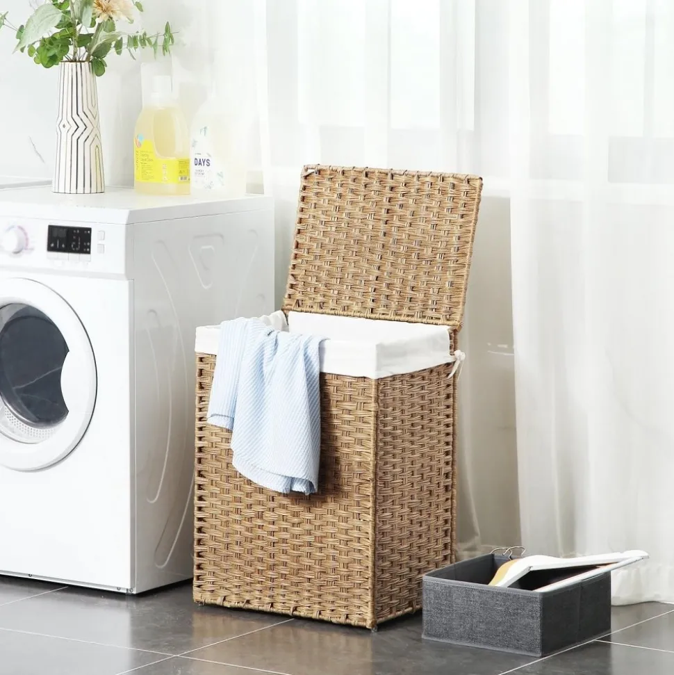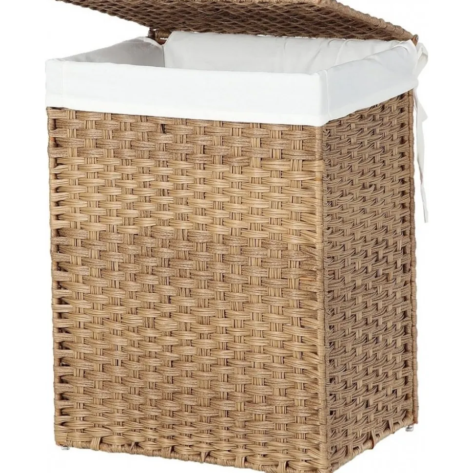 Tvättkorg av konstrotting och järn. Innerpåse av bomull som rymmer 90 liter.