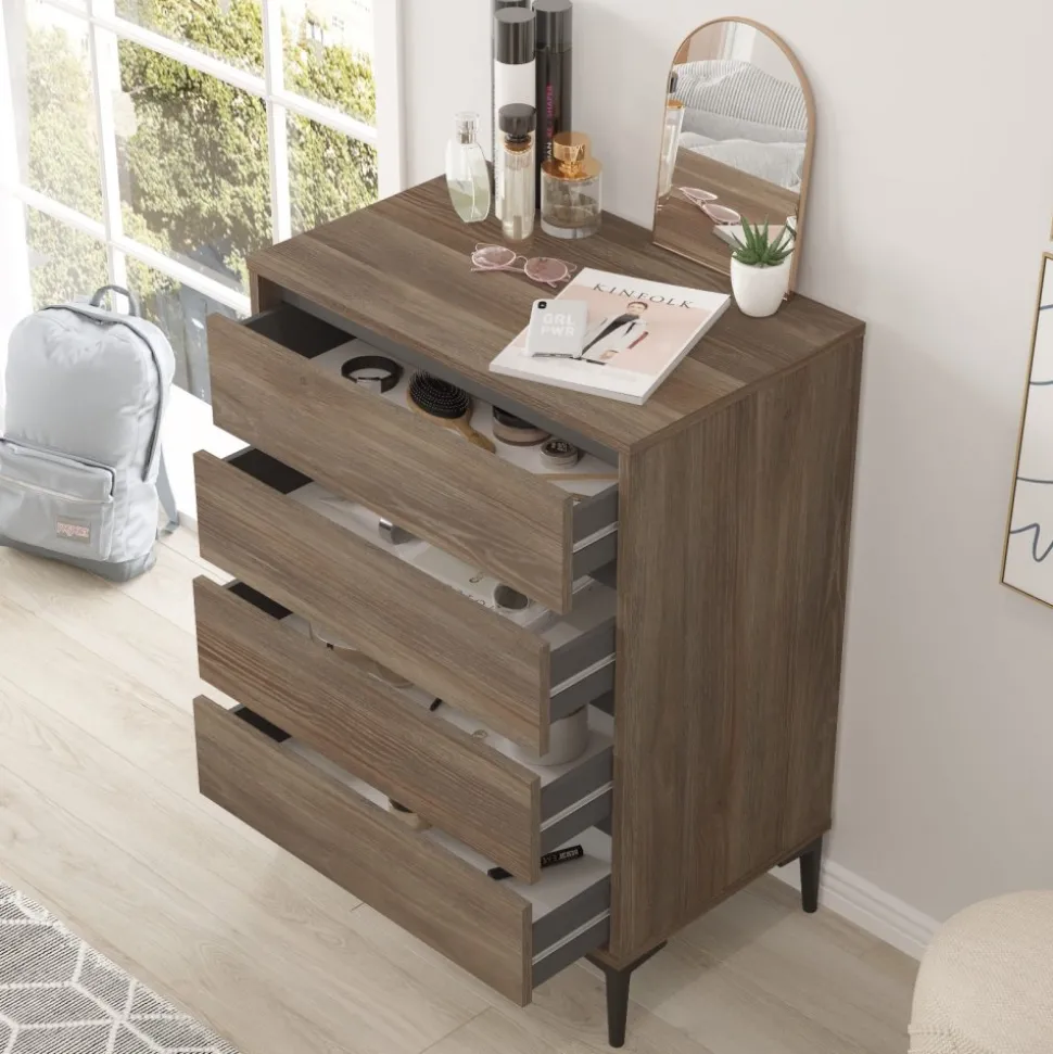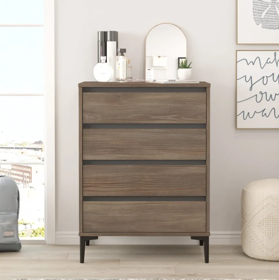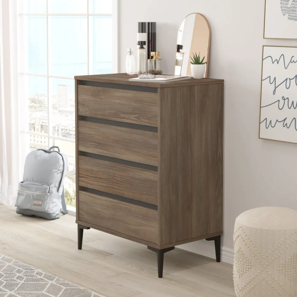 Byrå av melaminbelagd spånskiva. Ben av plast.