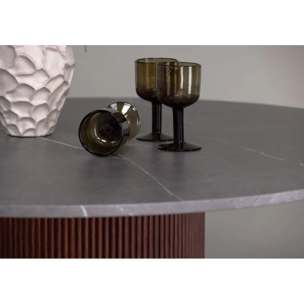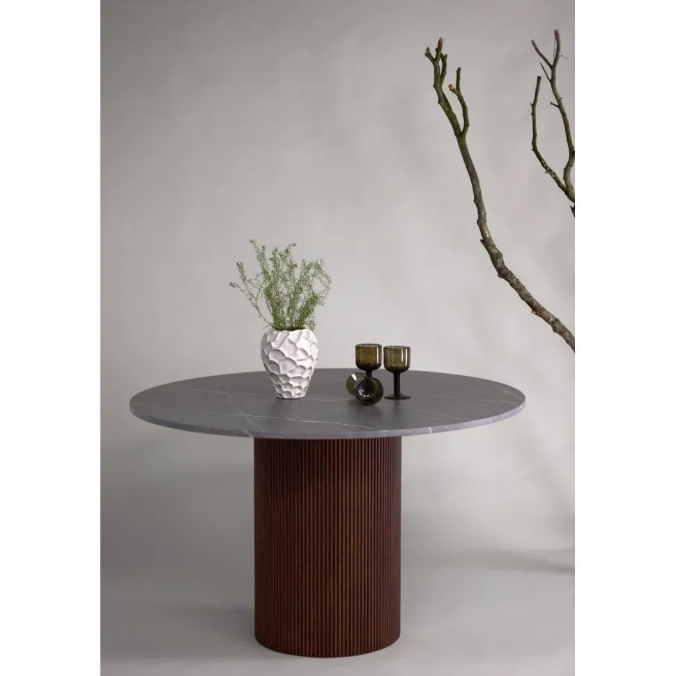 Matbord som har en unik design med en läcker skiva i sten!. Det här matbordet har en cylinderformad stomme i ribbat, mörkbrunt trä och en rund bordsskiva i sten som ger ett härligt liv åt blickfånget. Ett runt passar perfekt för att skapa gemenskap vid måltiderna, här hamnar ingen på kanten. Matcha med ett par bekväma matstolar och förläng de trivsamma stunderna kring matbordet.