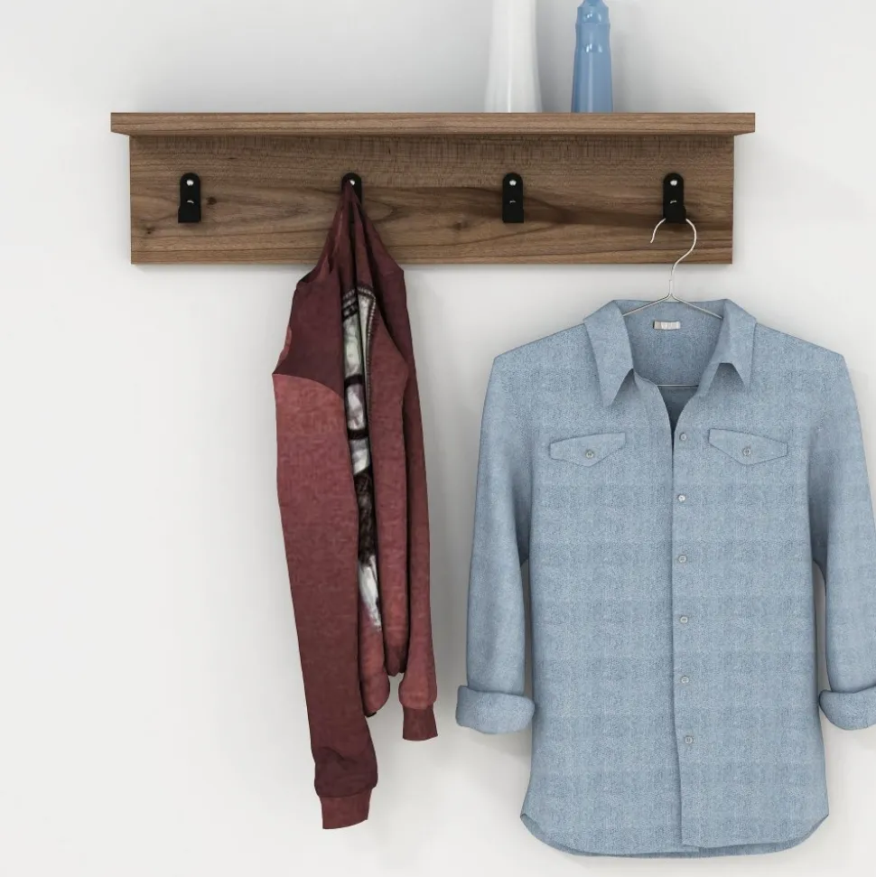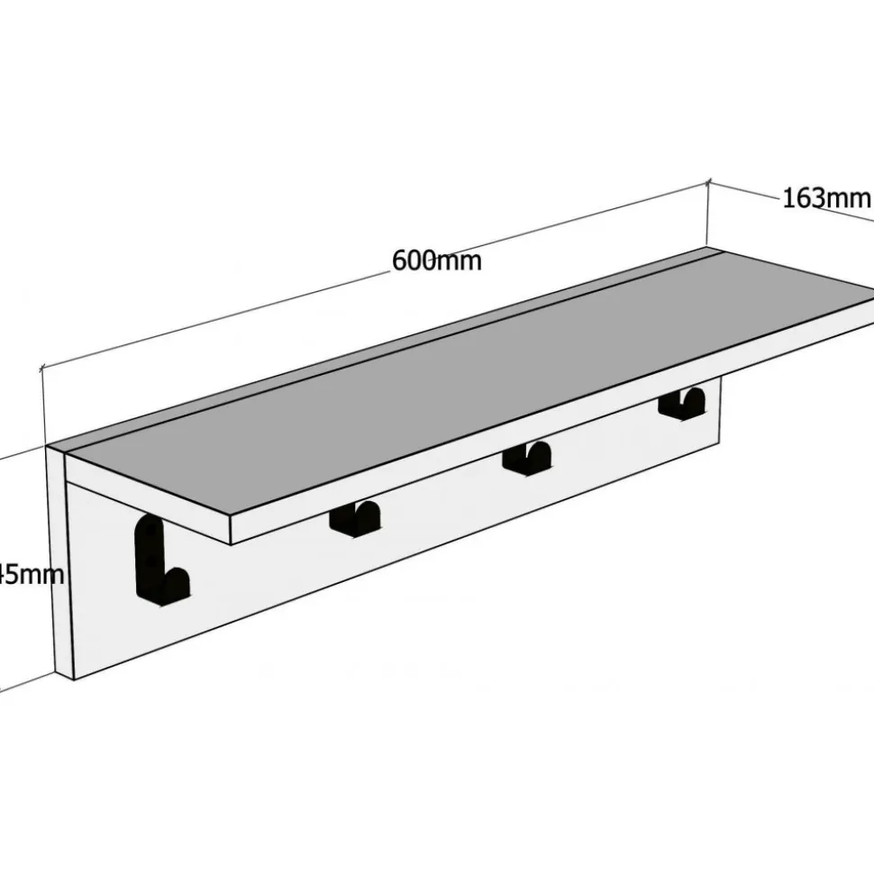 Vägghylla av melaminbelagd spånskiva.