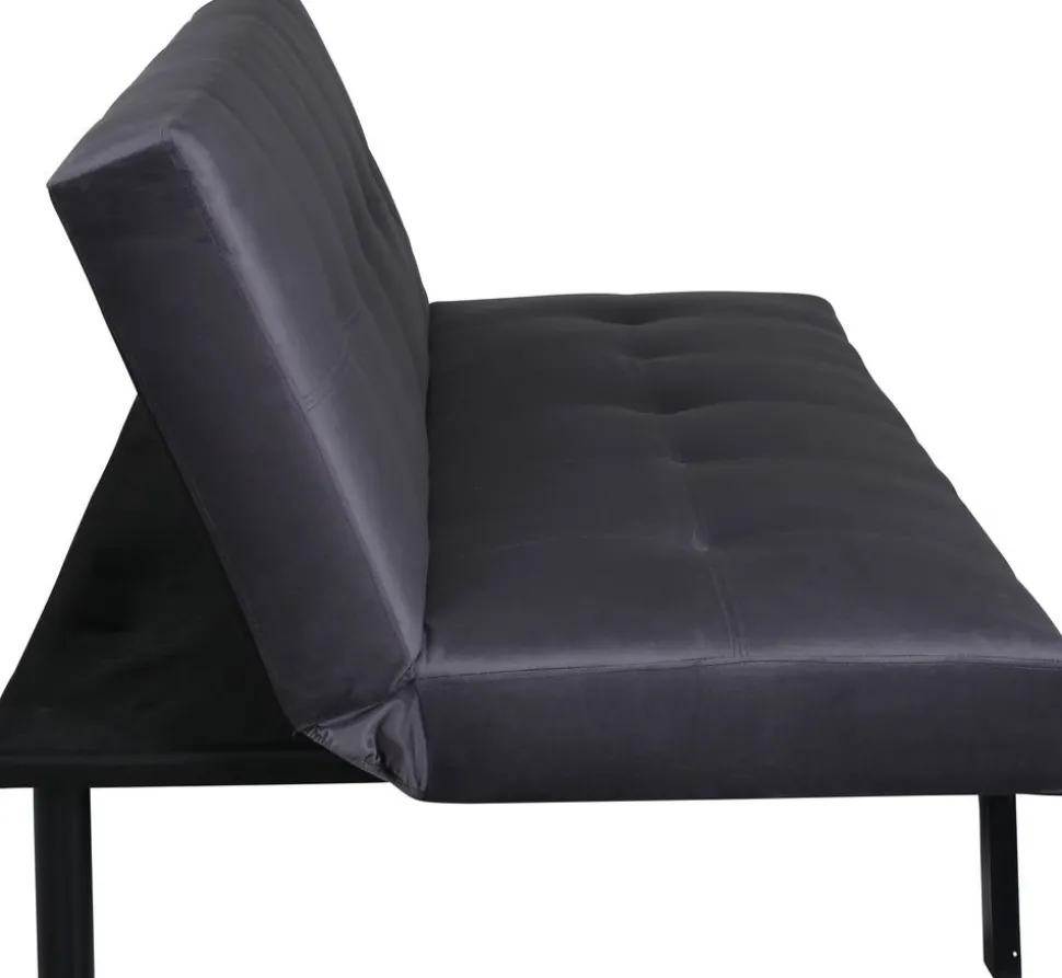 Modern klädd i grått sammet tyg. Lätt att skifta läge mellan och säng genom att fälla ned ryggstödet.