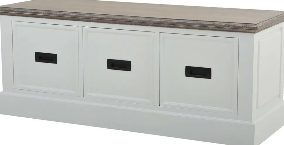 Modern bänk i vitt med toppskiva i grått, utrustad med tre lådor för effektiv förvaring. Svarta handtag som bryter av det vita på ett harmoniskt vis. En praktisk möbel som gör sig bra i de flesta hem. Ytskiktet på möbeln är behandlat för att ge ett vintage uttryck och har således lite märken och små skavanker. Färgskiftningar, märken, lagningar och småsprickor hör till dess unika utseende.