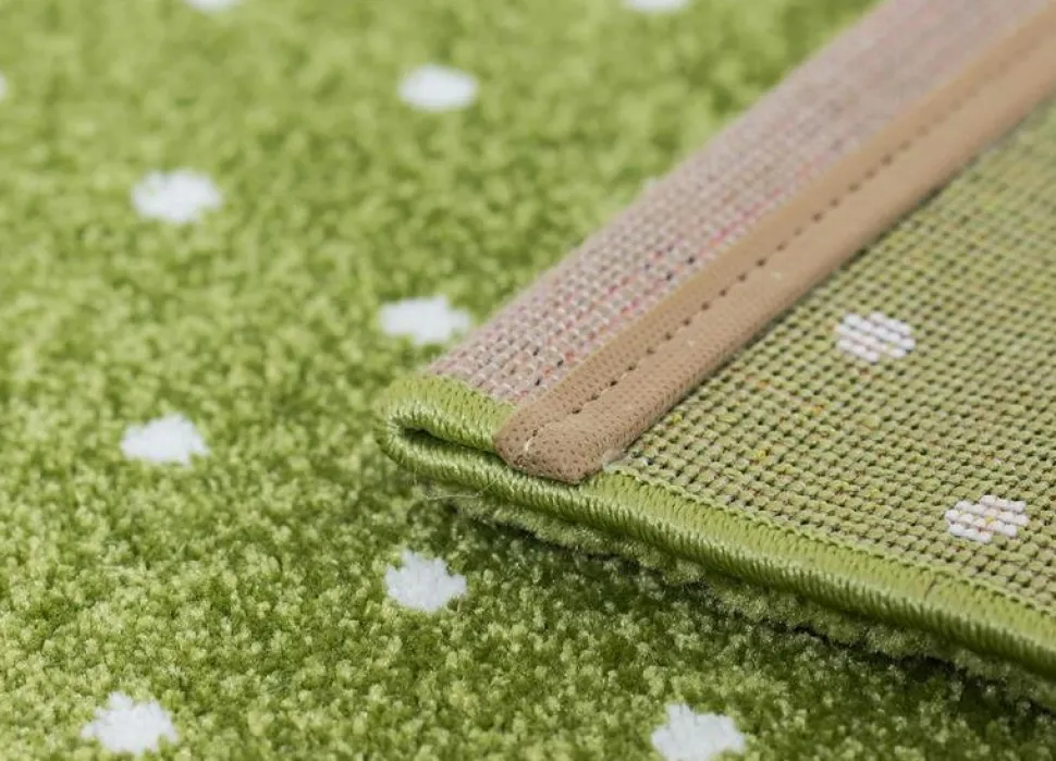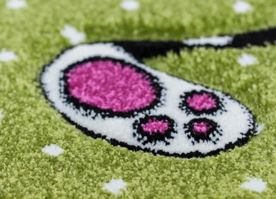 Holly är en färgglad barnmatta som har en grön botten med små vita prickar och pryds utav en glad katt och en söt liten humla.