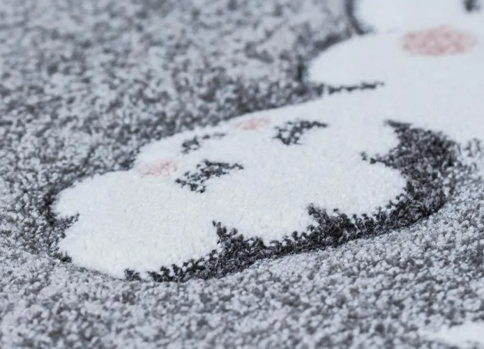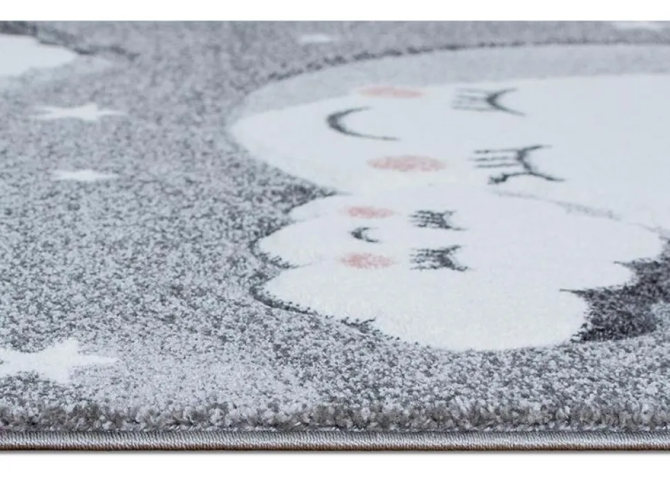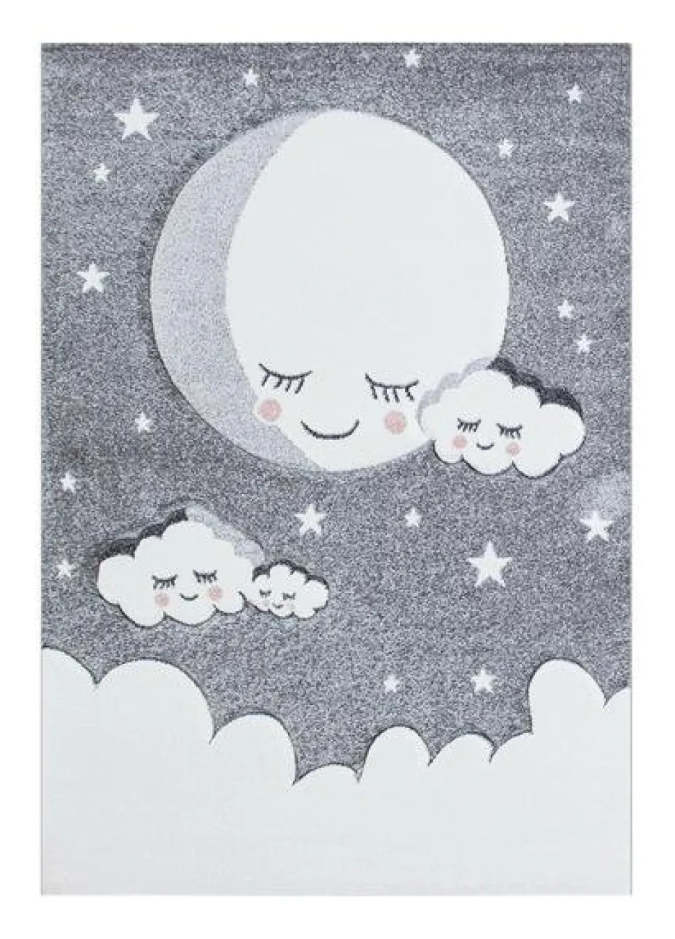 Sheri är en stilren som kommer i mjuka pastelltoner. Mattan har en grå botten som pryds utav en måne och moln, som har rosiga kinder i puderrosa.