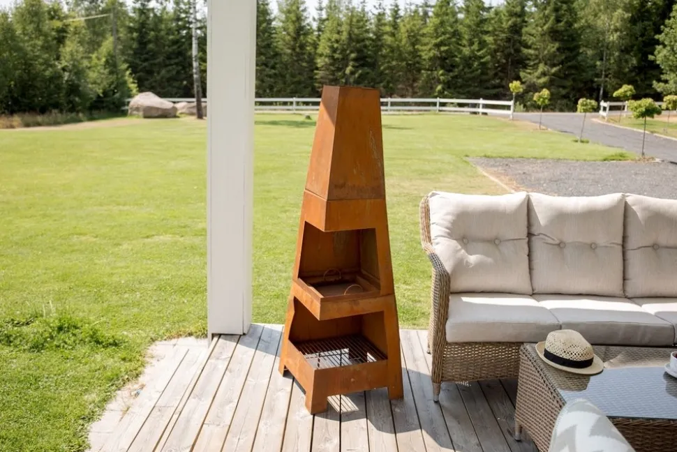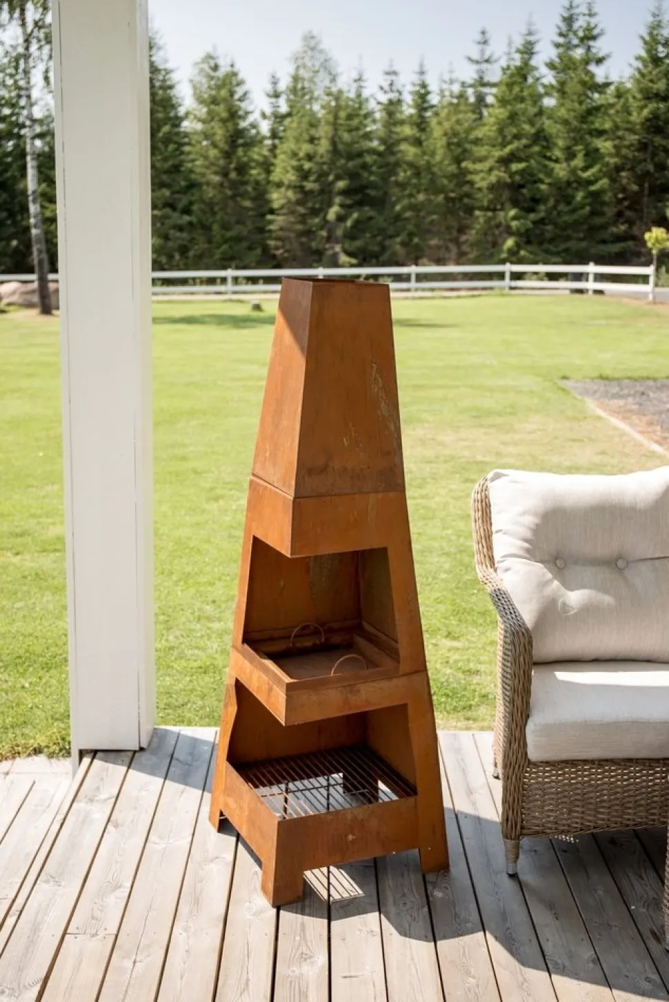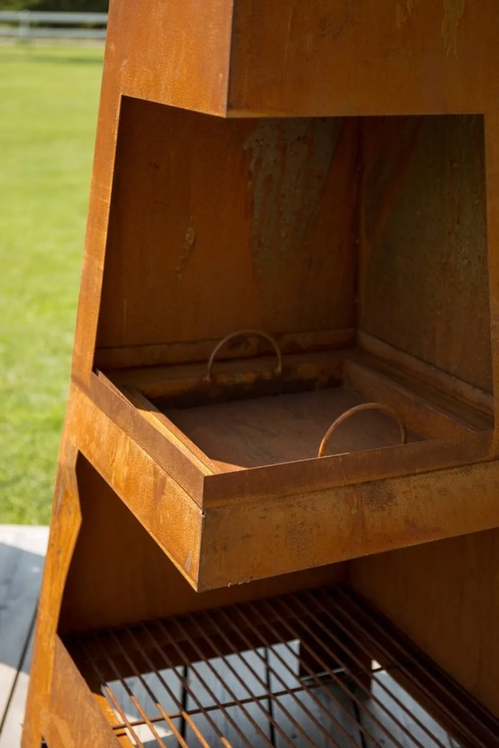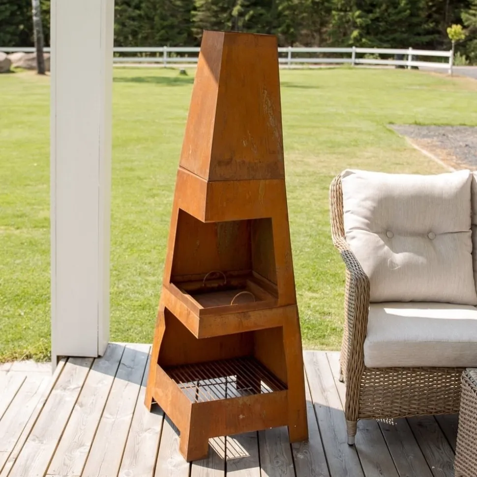 Höj stil- och mysfaktorn på uteplatsen med den här värmande eldstaden från serien Bastian. Designen är stilren med fyrkantig kropp som gradvis blir smalare mot toppen. Eldstaden är tillverkad av stål med en schysst rostig look. Det finns två öppningar på olika nivåer. Här kan du göra upp en mysig liten eld att värma dig och gästerna framför under försommaren och sena sommarkvällar. Tänk på att inte lämna eldstaden obevakad. Se våra tips för mer information om materialet och skötselråd. Tips från oss: Eldstaden är tillverkad i värmebeständigt stål. För att inte riskera att skada underlaget den är placerad på bör en skyddande bottenplatta finnas undertill. Se till att inte ha djur eller barn i närheten, elda under bar himmel och släck inte elden med vatten. Ej vattentålig.